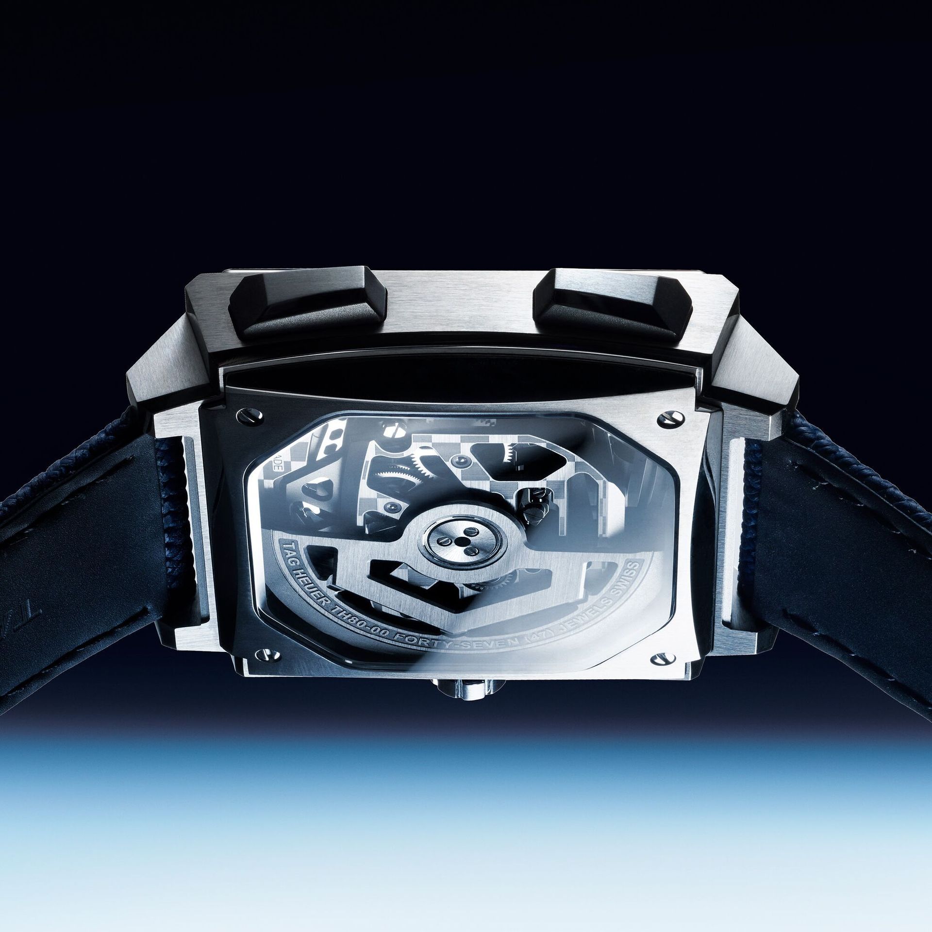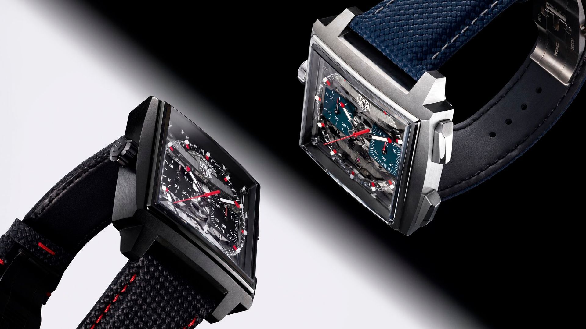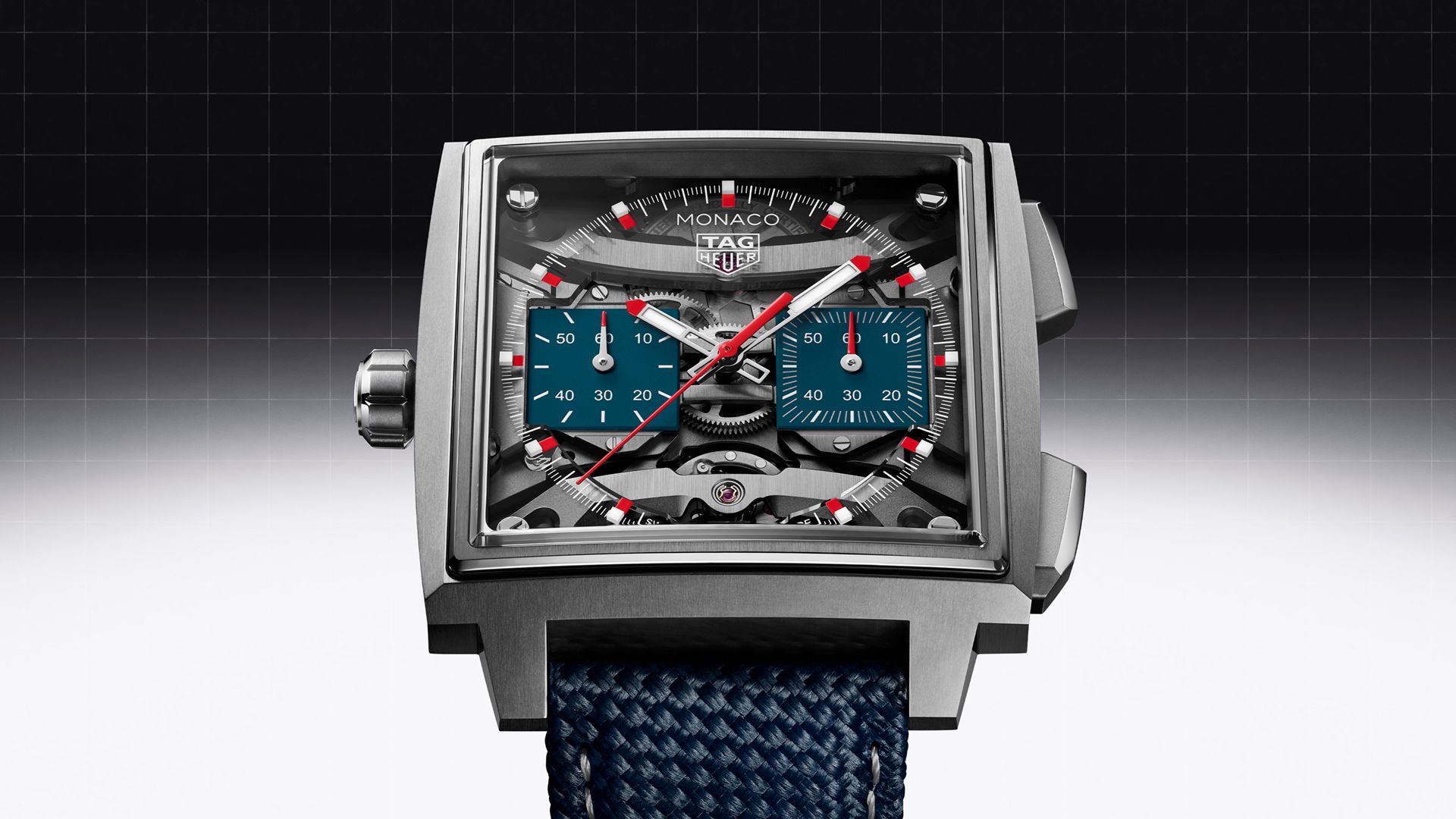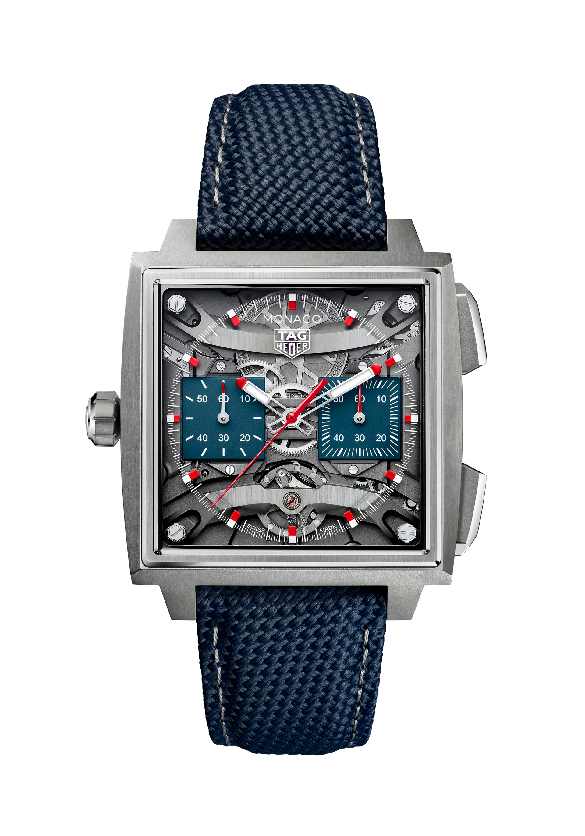 Een van de meest opvallende elementen is de transparante wijzerplaat, waarmee de vierkante architectuur van het uurwerk zichtbaar wordt gemaakt. Dat geeft de Evergraph een veel technischer en meer gelaagd karakter dan de klassiekere Monaco-modellen. Waar de Chronograph vooral speelt met historische codes, laat de Evergraph juist de binnenwereld van het horloge zien. Hierdoor ontstaat een meer avant-gardistische uitstraling die goed past bij de experimentele techniek erachter. TAG Heuer biedt de Evergraph in verschillende uitvoeringen aan, waaronder een versie in natuurlijk titanium met blauwe accenten en een variant in zwarte DLC-titanium met rode details.