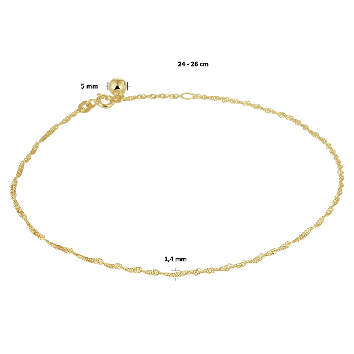 Trendy 14krt geelgouden 1.4mm singapore enkelbandje uitgevoerd met een poli afgewerkt bolletje van 5mm. Het enkelbandje heeft draaglengtes van 24 en 26cm