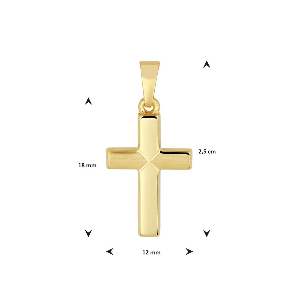 14krt geelgouden hanger in de vorm van een kruis. De hanger heeft een totale hoogte van 2.5cm en een breedte van 12mm.