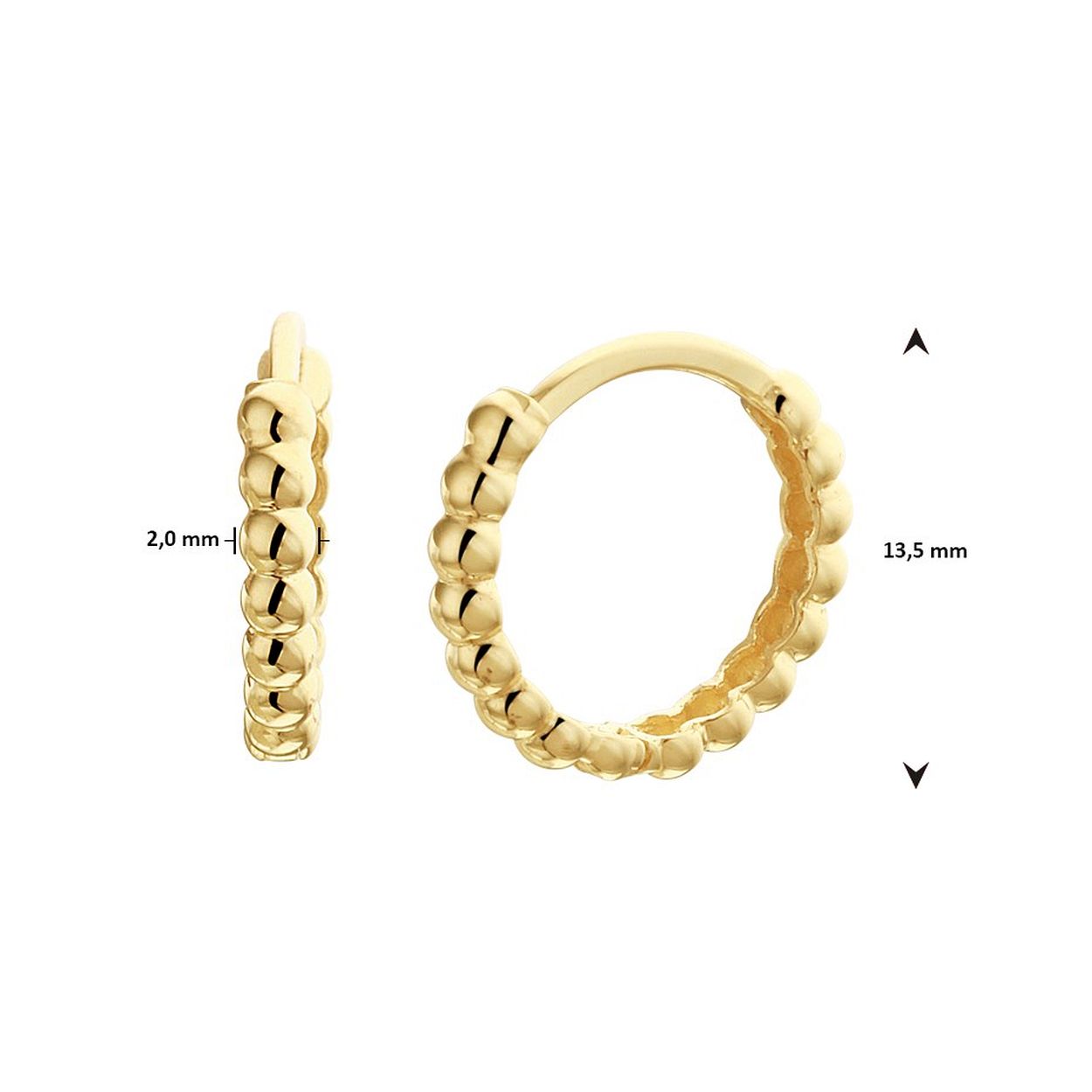 14k Geelgouden klapoorringen uitgevoerd met bolletjes. De oorringen hebben een afmeting van 13.5x2mm. De oorringen zijn exclusief de hangers.
