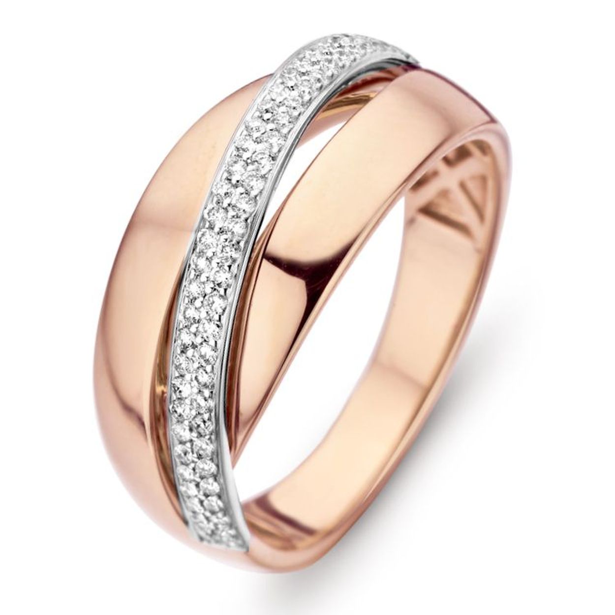 Prachtige 14krt bicolor rose- en witgouden ring met diamant 0,23crt H SI. De maat van de ring is 56 (17 3/4). Heeft u een andere maat neem dan gerust contact met ons op.