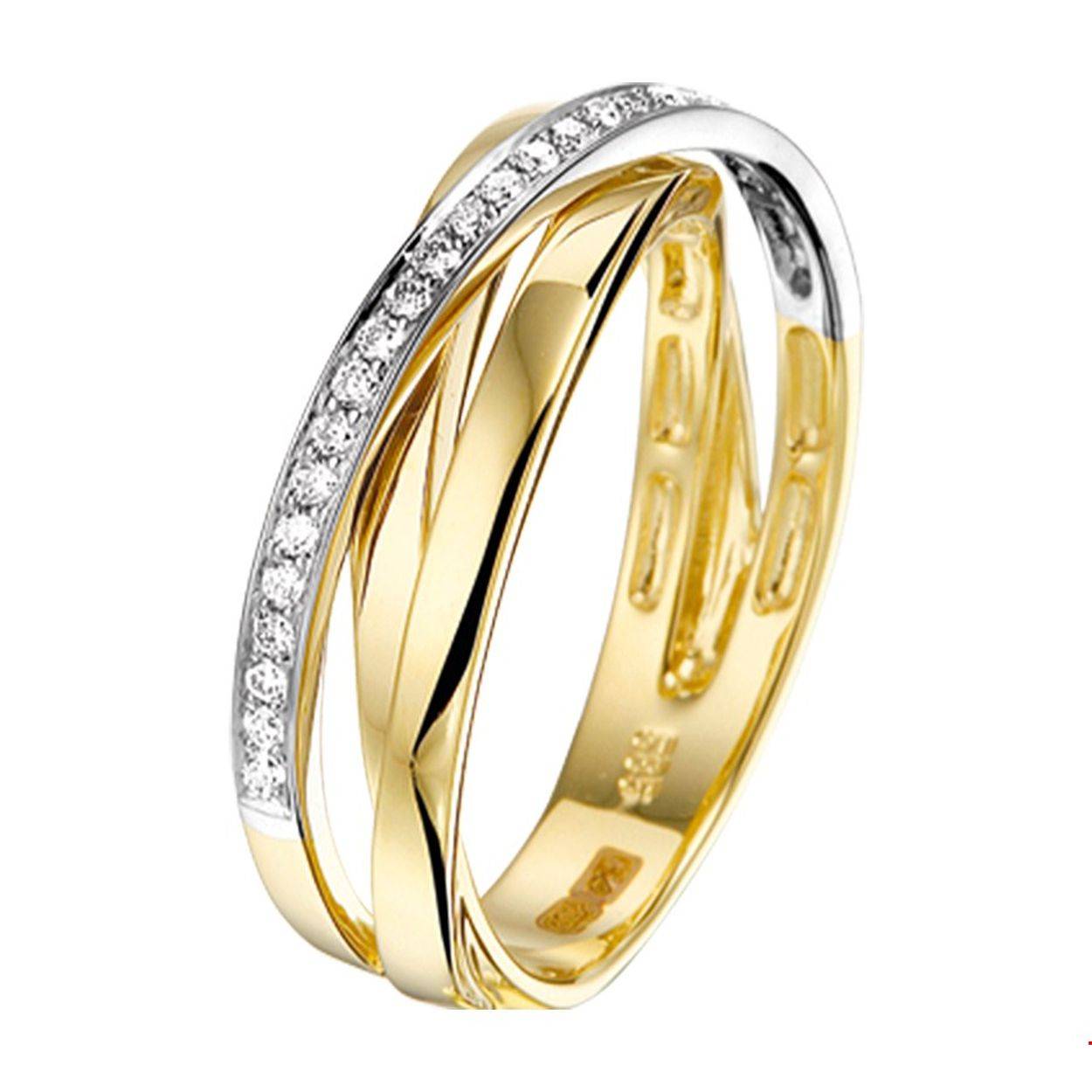 Prachtige 14krt gouden cross over ring met diamant, 0,16crt H Si. De maat van de ring is 55 (17,5). Heeft u een andere maat, neem dan contact met ons op.