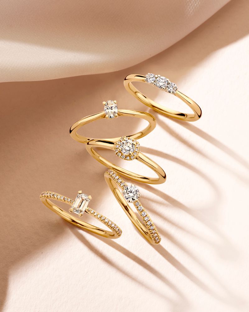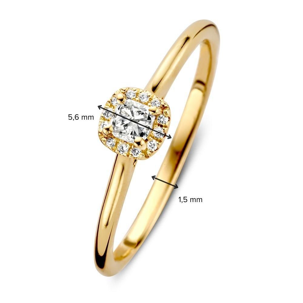 14krt geelgouden ring met briljant geslepen diamant in vierkante entourage zetting. Dankzij de verhoogde zetting, is de ring goed te combineren met een gouden of diamanten aanschuifring.