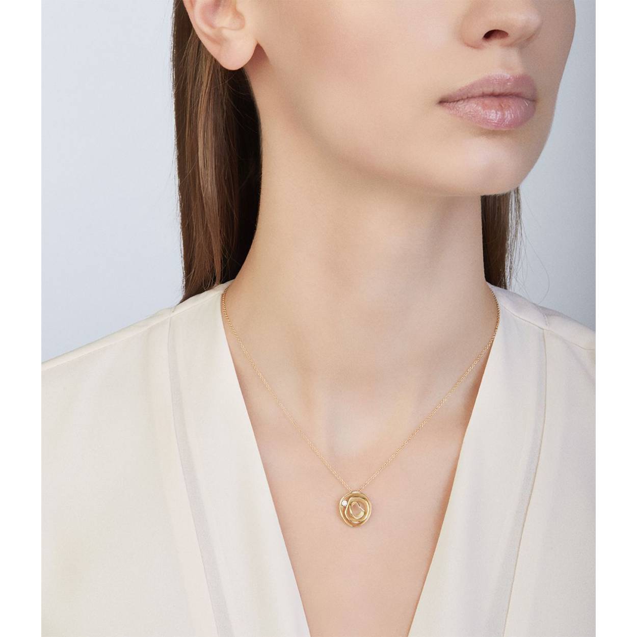 Dit unieke collier is vervaardigd uit 18 karaat goud en heeft een draaglengte van 45cm. De onregelmatige vormen van de hanger bootsen de woestijnduinen na. De hanger is voorzien van de gepatenteerde Aetherna- afwerking wat zorgt voor een fluweel-achtige structuur. Een solitair hanger met een gewicht van 0,05ct (Kleur  G, zuiverheid VSI) schittert tussen de gebogen lijnen. De unieke gele kleur is een resultaat van jarenlange onderzoeken. De kleur, Yellow Sunrise, is een warme gele kleur die de energie van de zon en een ongekende charme uitstraalt.