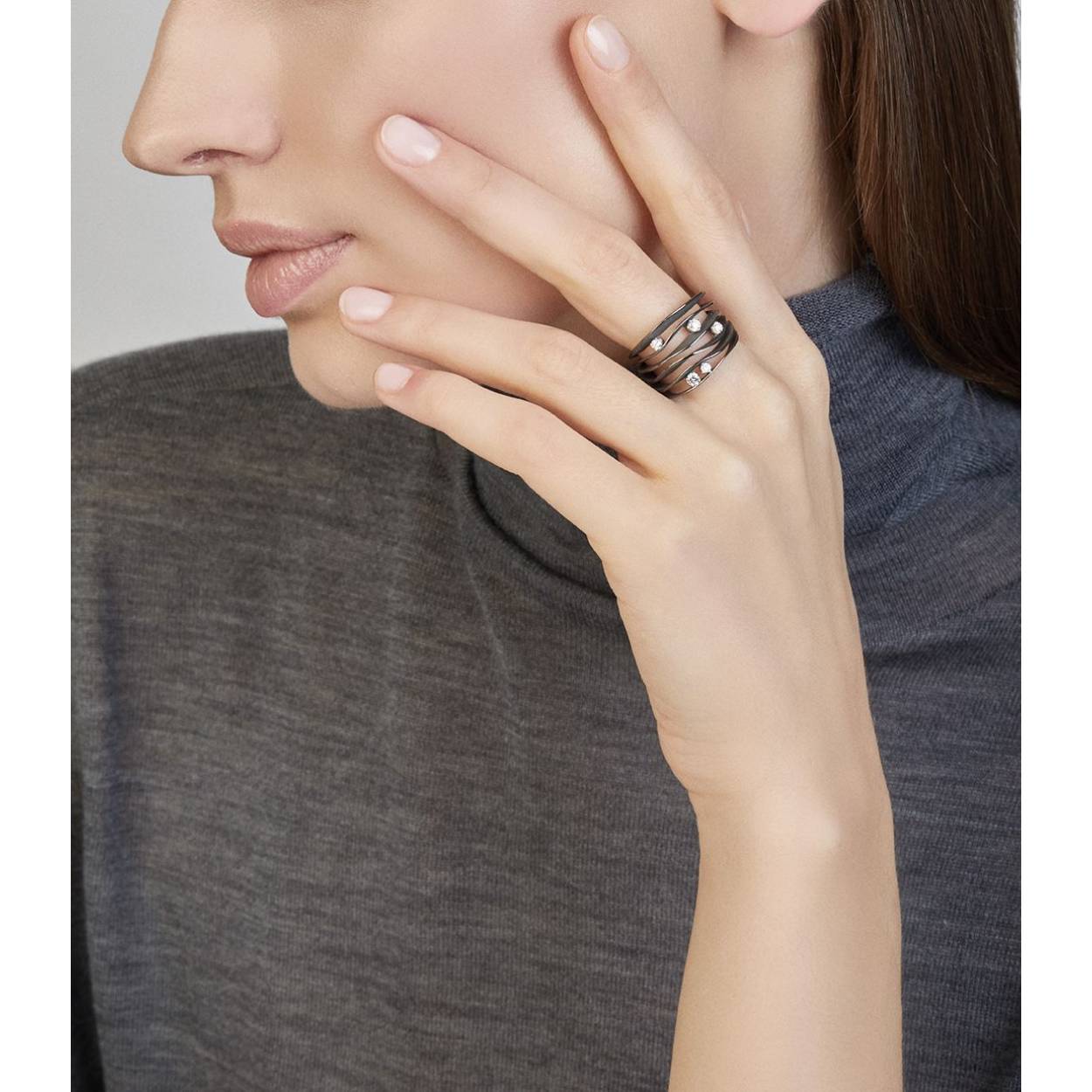 Deze onregelmatige vormen van deze unieke ring bootsen vloeiende bewegingen van de woestijnduinen na, een kenmerk van de Dune collectie. Annamaria Cammilli heeft al haar designs voorzien van één van haar 8 unieke kleuren. Deze ring is vervaardigd uit hoogwaardig 18 karaat goud en heeft kleur White Ice, Niet alleen wit goud, maar wit als ijs, puur als sneeuw, de lichtst mogelijke schaduw. De ring is sierlijk voorzien van 5 briljant geslepen diamanten met een totaalgewicht van 0,28 ct ( Kleur G, zuiverheid VSI).