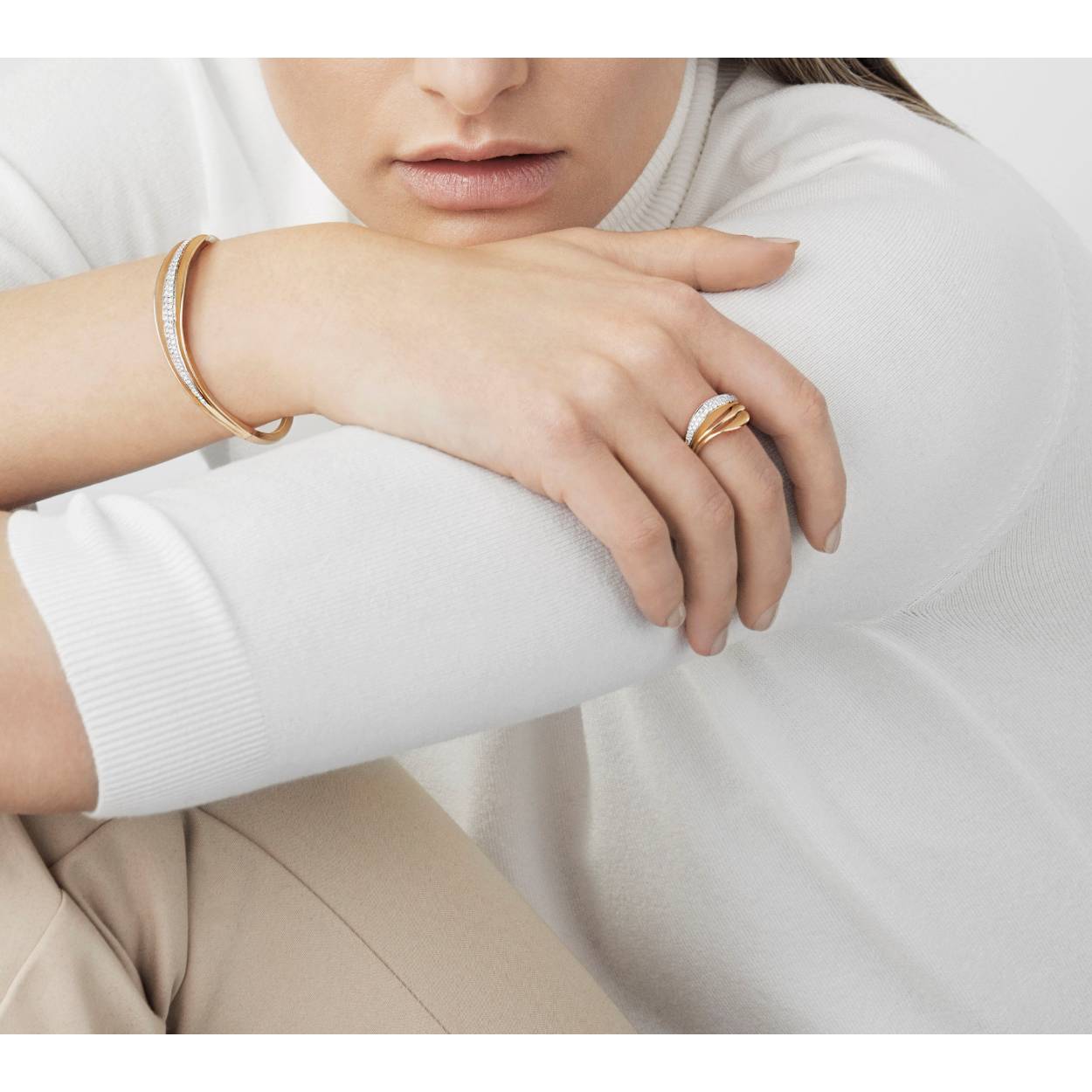 De krachtige volumes en vloeiende lijnen van deze ring maken dit een uniek kunstwerk. De ring is vervaardigd uit 18 karaat goud. Tussen de bovenste lijnen schitteren pavé gezette diamanten die een totaalgewicht van 0,20ct (Kleur G, zuiverheid VSI) hebben. De andere lijnen zijn voorzien van Cammilli's gepattenteerde Aetherna afwerking, wat zorgt voor een fluweelzachte uitstraling. De witgouden kleur is niet zomaar witgoud. De ring heeft de kleur White Ice, een goudkleur die Cammilli heeft ontworpen om haar designs te onderscheiden. De kleur is niet alleen wit goud, maar wit als ijs, puur als sneeuw, de lichtst mogelijke schaduw.