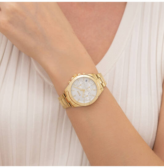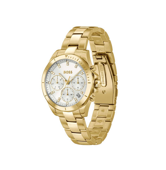 Dit BOSS horloge heeft een luxe sportieve uitstraling. Zeer geschikt voor de moderne stijlvolle vrouw van nu. Het dameshorloge valt op door zijn stalen horlogekast met een gladde goudkleurige bezel en een witte sunray wijzerplaat met een dag, datum en 24-uursaanduiding. Opvallend zijn de fijne wijzers. Aan de kast zit een stalen mat glanzende goudkleurige schakelband met een vouwsluiting. Het horloge heeft een doorsnee van 36mm met een mineraalglas en is 5ATM.