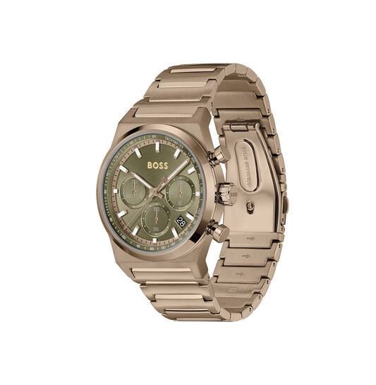 Dit Boss horloge heeft een unieke uitstraling. Het horloge heeft een rosegoudkleurige stalen kast en band met een diameter van 41MM. De mosgroene wijzerplaat is versierd met rodegoudkleurige wijzers en indexen en een chronograaffunctie. Het horloge is waterbestendig tot 5 ATM / 50 M en heeft een mineraalglas.
