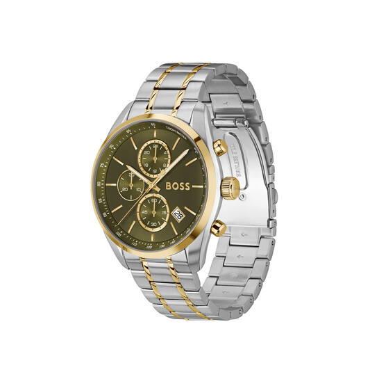 Dit Boss horloge heeft een stalen kast en band met goudkleurige pvd-coating. De combinatie met de groene chronograaf wijzerplaat zorgt voor een stoere sportieve look. Het horloge is waterdicht tot 5 atm en heeft een mineraalglas.Het past perfect bij een pak voor zakelijke bijeenkomsten of bij een casual outfit voor een avondje uit.