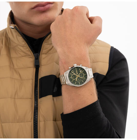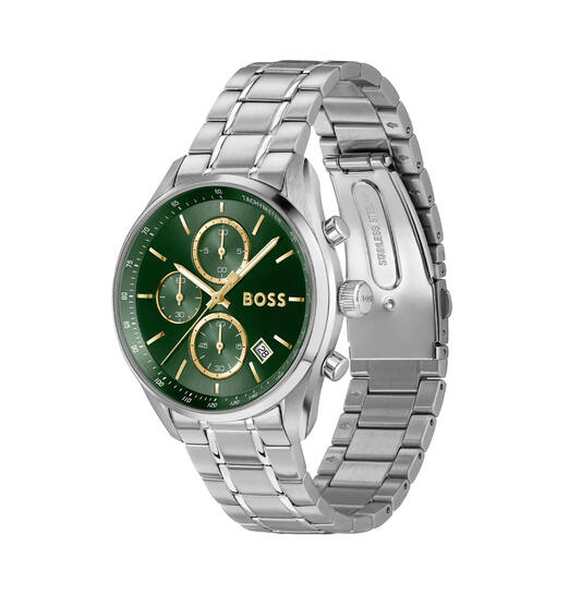 Dit Boss horloge heeft een stalen 40mm kast en band. De combinatie met de groene chronograaf wijzerplaat met goudkleurige details zorgt voor een stoere sportieve look. Het horloge is waterdicht tot 5 atm en heeft een mineraalglas. Het past perfect bij een pak voor zakelijke bijeenkomsten of bij een casual outfit voor een avondje uit.