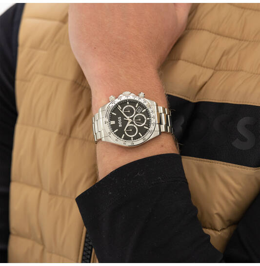 Dit Boss horloge is een sportief horloge. Het horloge heeft mineraalglas, een zwarte wijzerplaat en een stalen horlogekast met een kastdiameter van 43 mm. Op de zwarte chronograaf wijzerplaat is de datum af te lezen op 4-uur.