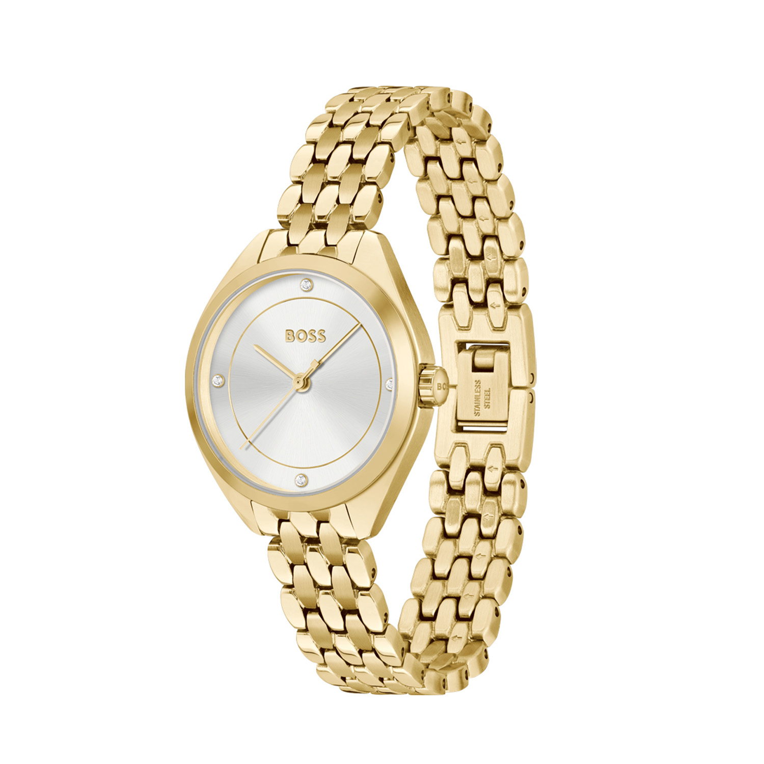 Dit BOSS horloge heeft een luxe zakelijke uitstraling. Zeer geschikt voor de moderne stijlvolle vrouw van nu. Het dameshorloge valt op door zijn apart gevormde goudkleurige stalen horlogekast met een gladde goudkleurige bezel en een zilverwitte wijzerplaat met op de 3, 6, 9 en 12 een kristal als uursaanduiding. De fijne wijzers en de fijne uursaanduiding geven dit horloge een chique uitstraling. Aan de kast zit een prachtige goudkleurige fijne stalen schakelband met een vouwsluiting. De kast van het horloge heeft een doorsnee van 30mm met mineraalglas en is 3ATM.
