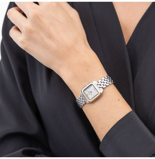 Dit Boss horloge heeft een elegante uitstraling. De vierkante 22mm kast is versierd met een goudkleurige bezel en een slanke schakelband. Het horloge is getest op een waterdichtheid van 3 atm en is afgewerkt met mineraalglas.