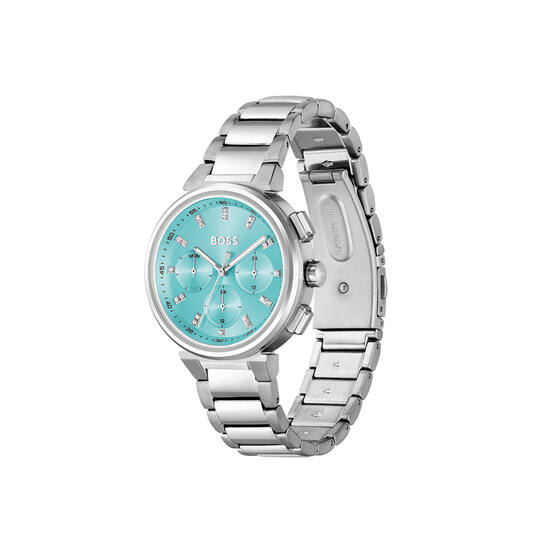 Dit BOSS horloge heeft een stijlvolle look. Zeer geschikt voor de moderne stijlvolle vrouw van nu. Het dameshorloge valt op door zijn stalen ronde horlogekast met een gladde bezel en een turquoise sunray wijzerplaat met dag, datum, en 24-uursaanduiding. Aan de kast zit een stalen schakelband met vouwsluiting. De kast van het horloge heeft een doorsnee van 38mm met mineraalglas en is 3ATM.