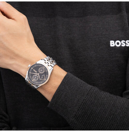 Dit Boss horloge heeft een stalen 41MM kast met een rosegoudkleurige bezel, en een stalen band. Op de grijze wijzeplaat is een de dag, datum en 24-uurs aanduiding af te lezen. Het horloge heeft rosegoudkleurige wijzerplaten en indexen waardoor het horloge duidelijk af te lezen is. Het horloge is waterdicht tot 5 atm en heeft mineraalglas.