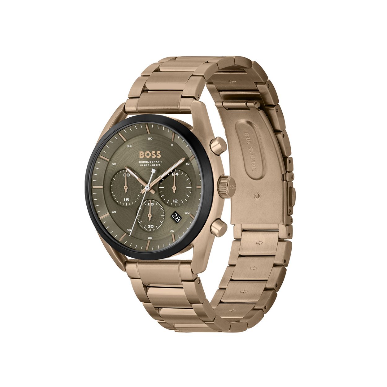 Dit BOSS horloge heeft een luxe sport uitstraling. Zeer geschikt voor de moderne man van nu. Het herenhorloge valt op door zijn beige goudkleurige stalen horlogekast met een gladde donkere bezel en een olijf groene wijzerplaat met chronograaf, datum en 24-uursaanduiding. De fijne wijzers en de fijne uursaanduiding geven dit horloge een chique uitstraling. Het horloge heeft een schroefkroon, waardoor het horloge beter bestendig is tegen water. Aan de kast zit een beige goudkleurige stalen schakelband met een vouwsluiting. De kast van het horloge heeft een doorsnee van 44mm met mineraalglas en is 10ATM.