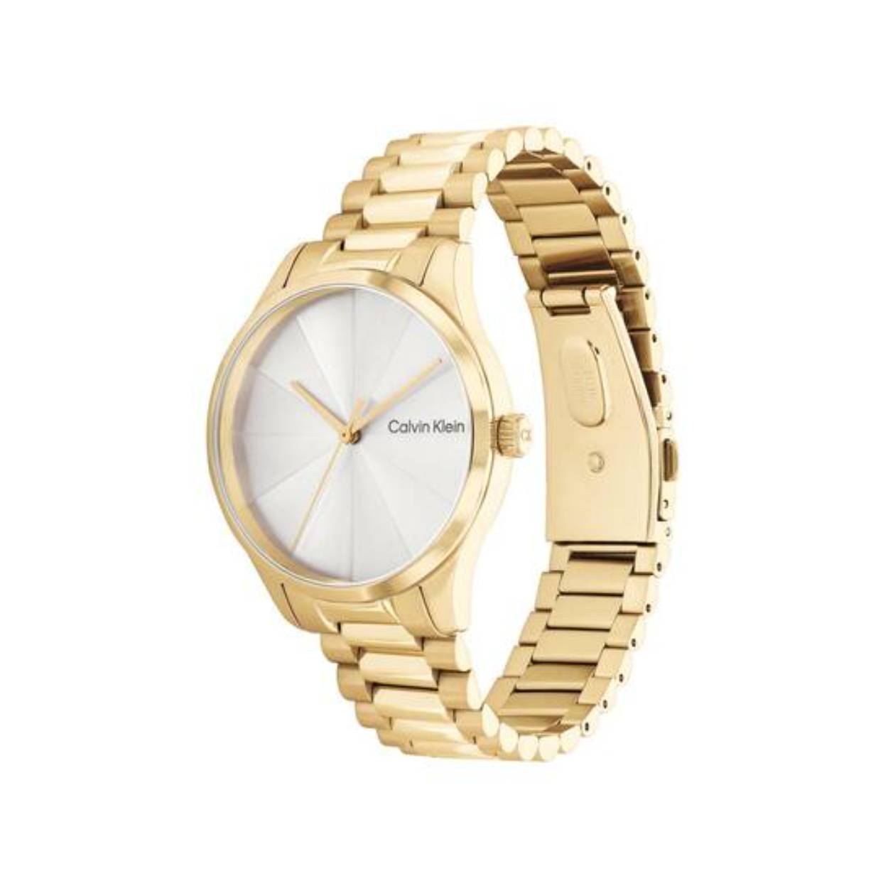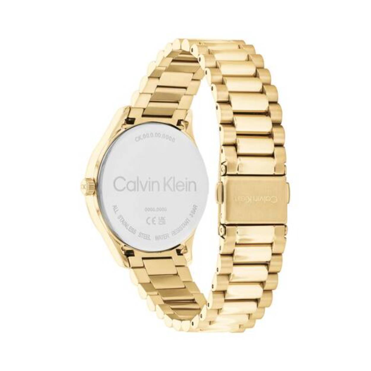 Dit chique Calvin Klein horloge heeft een goudkleurige stalen kast en band. De witte wijzerplaat is voorzien van het Calvin Klein logo op 3 uur en goudkleurige wijzers. Het horloge is waterbestendig tot 3 atm en wordt afgeschermd door mineraalglas.