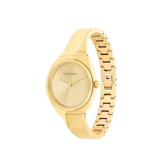 Dit Calvin Klein horloge is een chique en charmant ontwerp. De stijlvolle ronde gladde goudkleurige stalen kast heeft een goudkleurige wijzerplaat met een gladde zacht goudkleurige bezel. Op de wijzerplaat is alleen de merknaam gedrukt en de tijd wordt aangegeven met hele fijne wijzers. Aan de stalen kast zit een goudkeurigekleurige bangle band. Het sierlijke horloge heeft een mineraalglas, een doorsnee van 30mm en is 3 ATM.