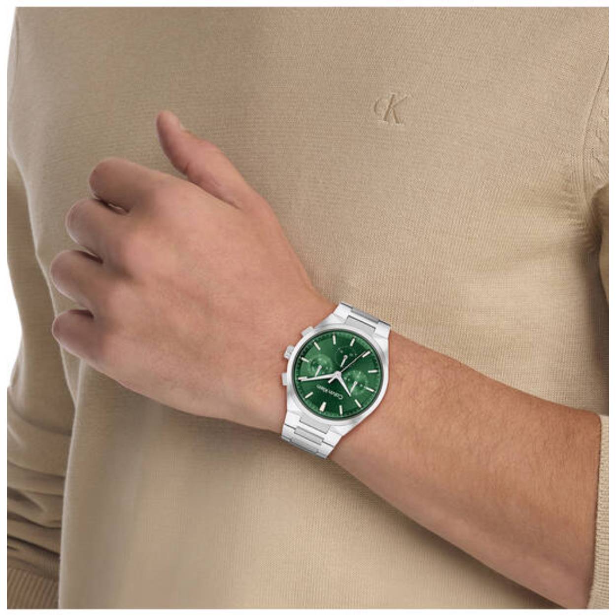 Dit stoere Calvin Klein horloge heeft een stalen kast en band. Op de groene wijzerplaat zijn de tijd, dag en datum goed afleesbaar door de zilveren accenten. De wijzerplaat wordt afgeschermd door mineraalglas. Dit horloge past bij zowel een casual outfit, als een net pak.