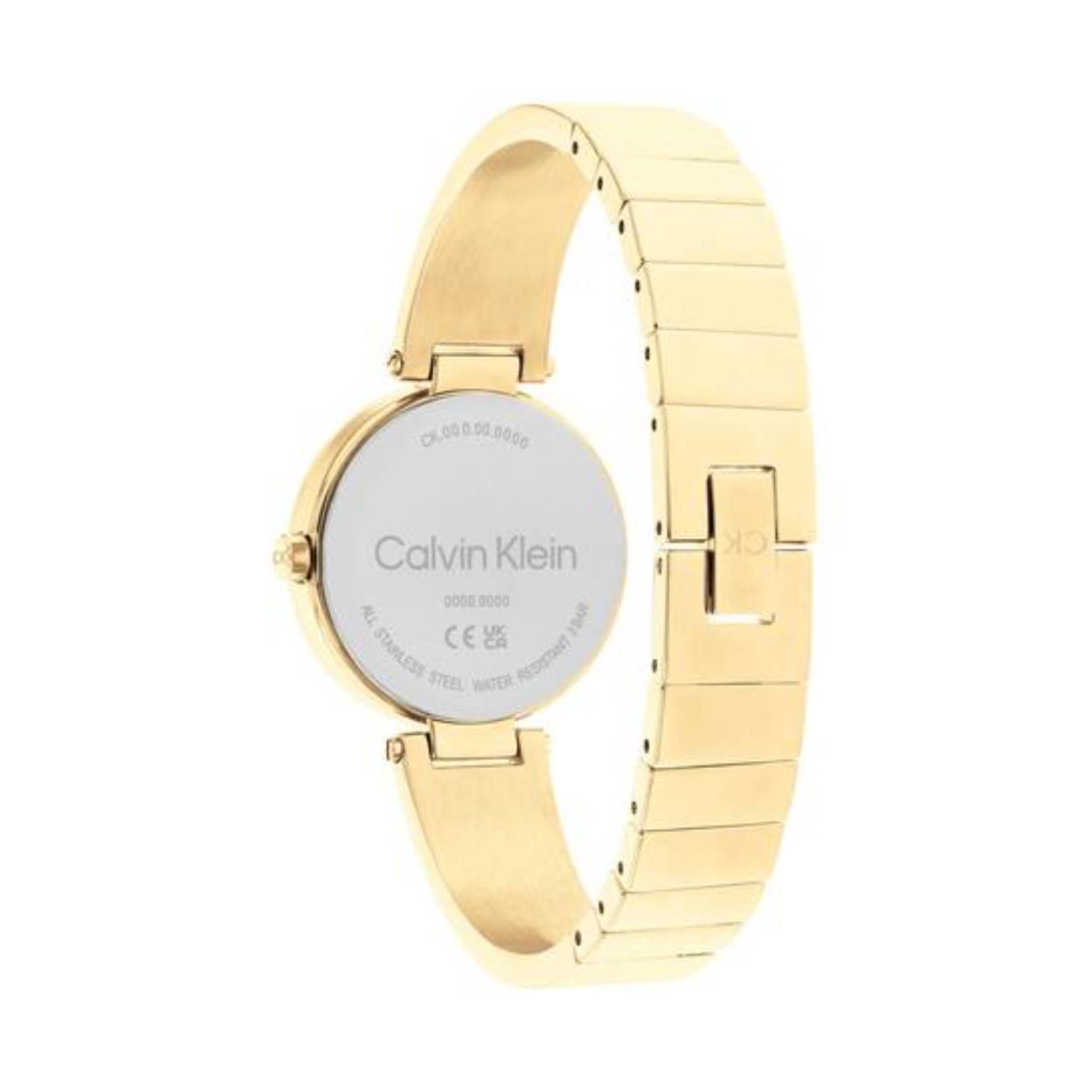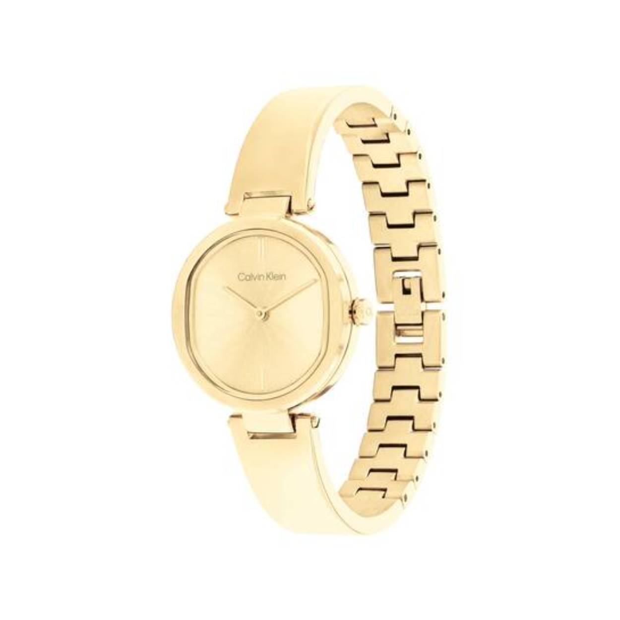 Dit unieke Calvin Klein horloge heeft een goudkleurige stalen kast en band. Het horloge is verstelbaar door de schakels die verborgen zijn aan de achterkant van het horloge. Dit zorgt ervoor dat het horloge stevig om de pols blijft zitten, ondanks zijn bangle armband uitstraling. de goudkleurige wijzerplaat heeft een 12- en 6 uurs aanduiding. De wijzerplaat wordt afgeschermd door mineraalglas.