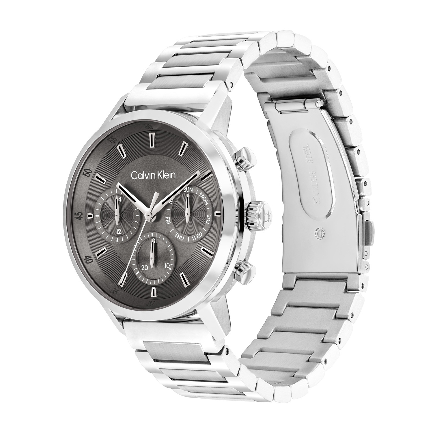 Dit Calvin Klein horloge is een stijlvol ontwerp. De ronde stalen kast heeft een glimmende bezel en een grijze geborstelde sunray wijzerplaat met een dag, datum en 24-uursaanduiding. Aan de kast zit een stalen schakelband met een vouwsluiting. Het stoere herenhorloge heeft een mineraalglas, een doorsnee van 41mm en is 3ATM.
