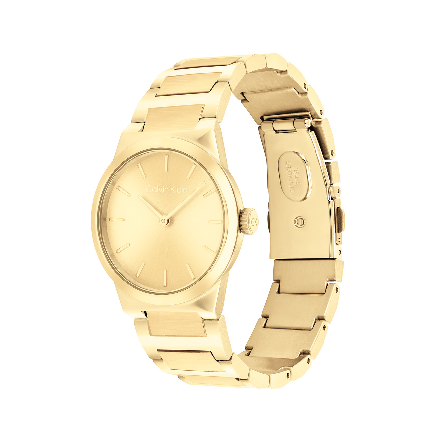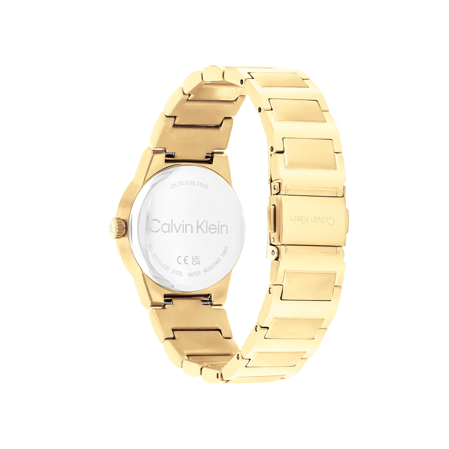Dit Calvin Klein horloge is een tijdloos ontwerp. De stijlvolle ronde stalen goudkleurige kast heeft een gladde bezel en een goudkleurige sunray wijzerplaat met fijne goudkleurige wijzers en streepjes. Strak aan de ronde kast zit een goudkleurige stalen mat glanzende schakelband met een vouwsluiting. Het elegante dameshorloge heeft een mineraalglas, een doorsnee van 32mm en is 3ATM.