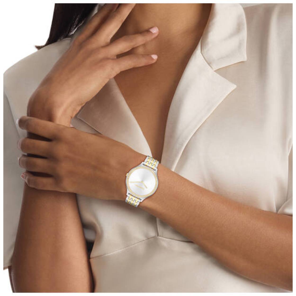 Dit tijdloze horloge heeft een bicolor stalen band en kast. De witte wijzerplaat is door gouden indexen en wijzers goed afleesbaar. De goudkleurige bezel is afgewerkt met zirkonia's. Het horloge is waterbestendig tot 3 atm en wordt afgeschermd door mineraalglas.