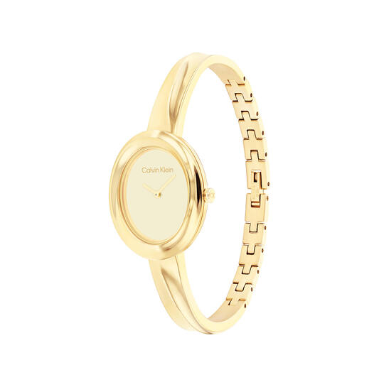 Dit Calvin Klein horloge is een chique en stijlvol ontwerp. De stijlvolle goudkleurige ovale stalen kast heeft een goudkleurige glanzende wijzerplaat met enkel wijzers en de merknaam. Strak aan de vol glimmende kast zit een goudkleurige bangle band met klapsluiting. Inkorten kan dmv schakels te verwijderen aan de onderkant. Het opvallende horloge heeft een mineraalglas, een doorsnee van 26mm en is 3ATM.