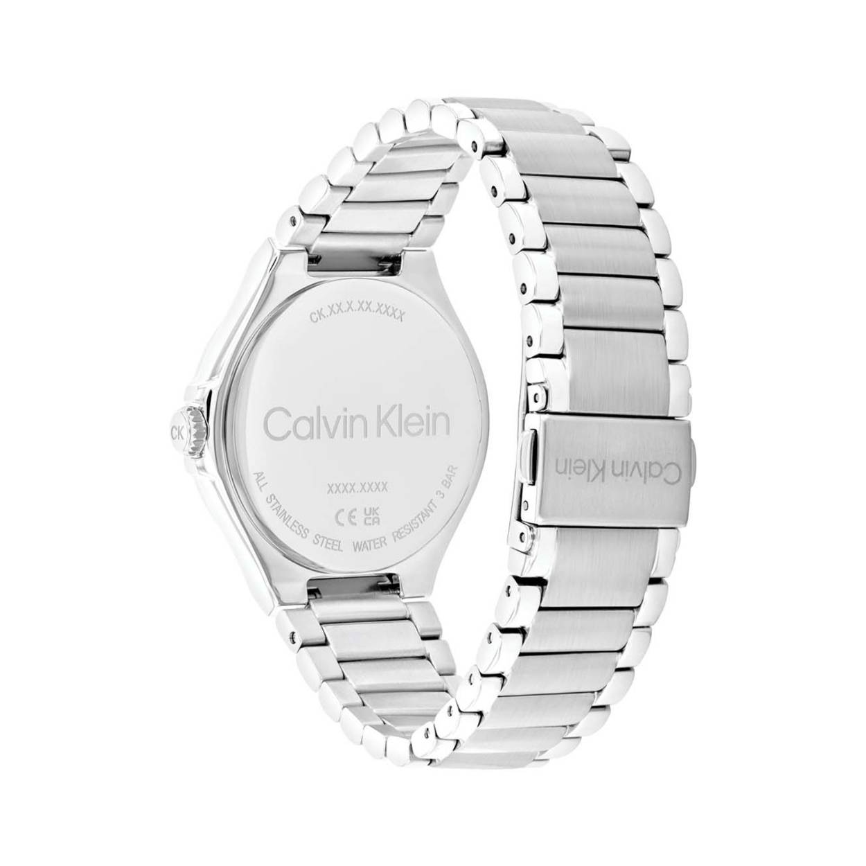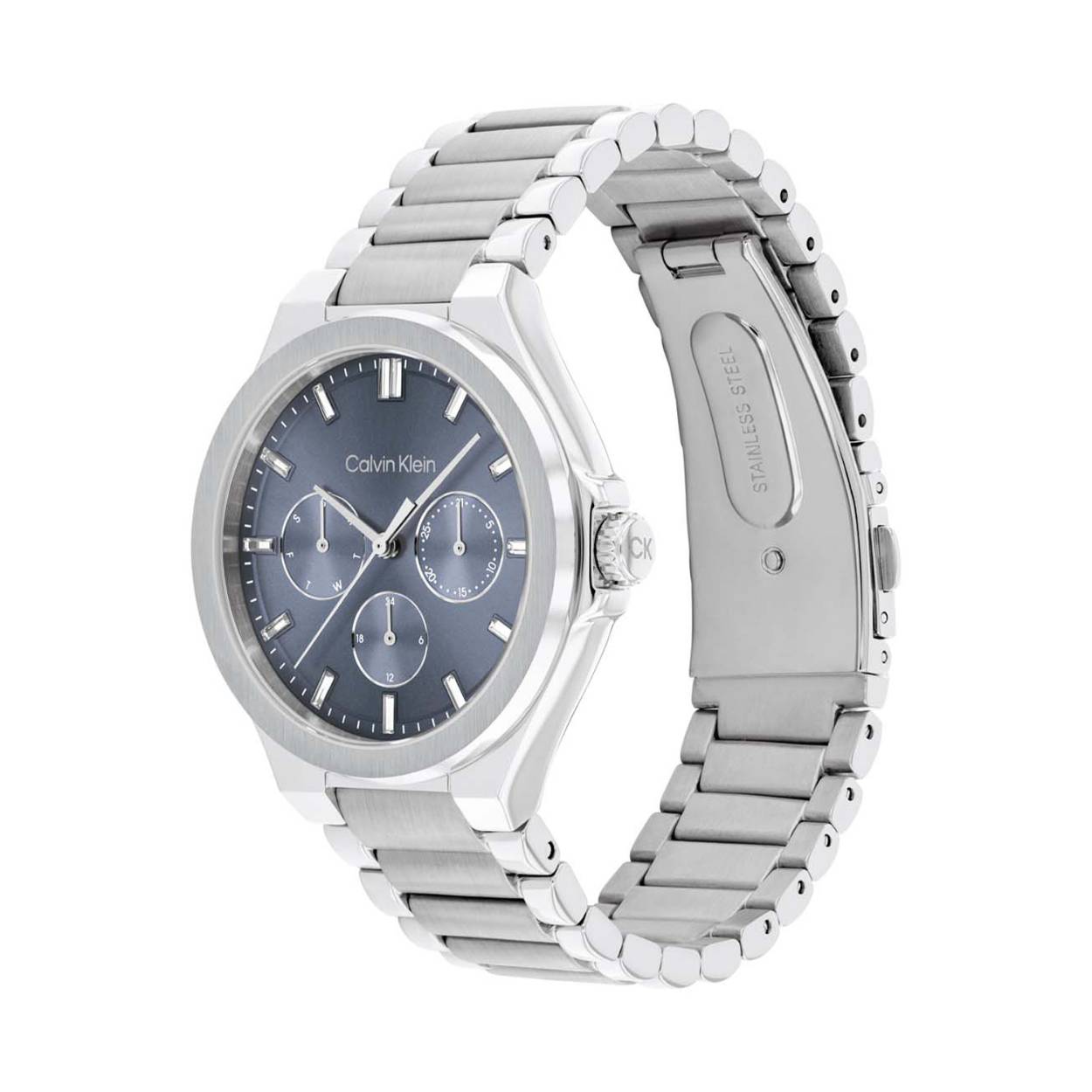 Dit Calvin Klein dameshorloge is een sportief en luxe ontwerp. De ronde zilverkleurige stalen kast heeft een blauwe sunray wijzerplaat met dag, datum en 24-uursaanduiding. Aan het dameshorloge zit een zilverkleurige schakelband met vouwsluiting. Het multifunctionele horloge heeft een mineraalglas, een doorsnee van 38mm en is 3ATM waterdicht.