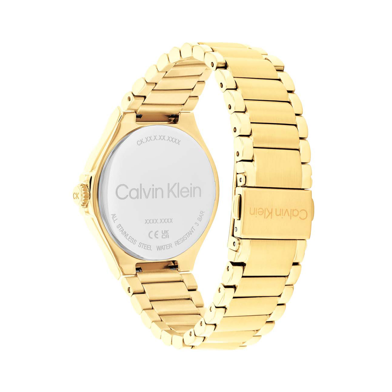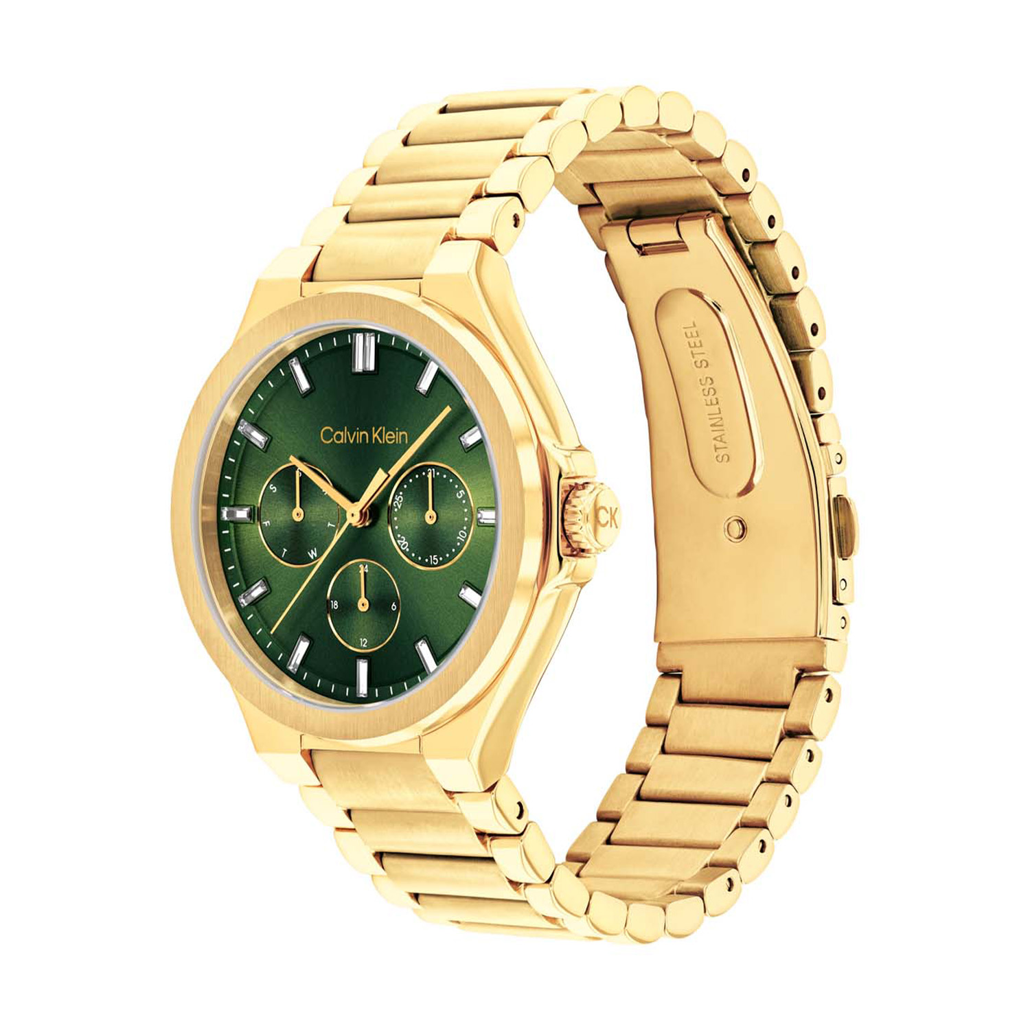 Dit Calvin Klein dameshorloge is een sportief en luxe ontwerp. De ronde goudkleurige stalen kast heeft een groene sunray wijzerplaat met dag, datum en 24-uursaanduiding. Aan het dameshorloge zit een goudkleurige schakelband met vouwsluiting. Het multifunctionele horloge heeft een mineraalglas, een doorsnee van 38mm en is 3ATM waterdicht.