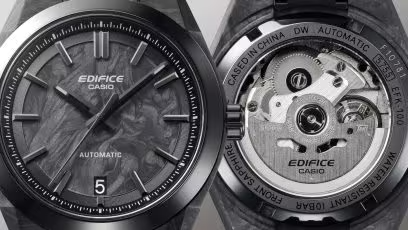 De wijzerplaat en kast zijn gemaakt van het state-of-the-art gesmede carbon dat wordt gebruikt in high-end sportauto's. Het geeft de dynamiek weer van een sportauto die naar hogere prestaties snelt in een uitgesproken EDIFICE-stijl. Gesmeed koolstof is een composietmateriaal van koolstofvezels gekneed in hars en vervolgens gesmeed bij hoge temperaturen onder intense druk, en het is zowel sterker als lichter dan metaal.