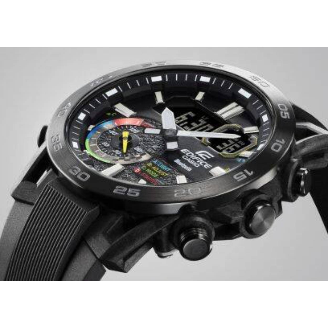 Maak kennis het beste motorsporthorloge. De EDIFICE SUSPENSIONE ECB-40 heeft het allemaal; vorm, functionaliteit en verfijning. Het horloge beschikt over een horlogekast van met koolstofvezel versterkt hars en Smartphone Link. Het unieke ontwerp van de kast is geïnspireerd op de wielophanging van racewagens, met vier draagarmen in een dubbele gevorkte ophanging, twee boven en twee onder. Met koolstofvezel versterkte hars zorgt voor een lichte, maar toch sterke kast. Dankzij Smartphone Link maakt dit bijzondere uurwerk automatisch verbinding wanneer het binnen het bereik van een gekoppelde smartphone komt. Gebruik de speciale app voor toegang tot de functies die zo belangrijk zijn voor raceteams, zoals automatische nauwkeurige tijdregistratie, moeiteloos beheer van de wereldtijd en het overzetten naar je smartphone van de stopwatchgegevens van tot wel 200 rondetijden die op de milliseconde zijn gemeten. Het dubbele ledlicht met hoge lichtsterkte van de Super Illuminator verlicht het digitaal-analoge display, zodat het zelfs in het donker goed leesbaar is.