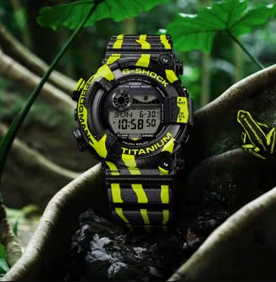 Gedurfde verticale strepen in fluorescerend groen steken af tegen een zwarte basis voor een opvallende, stoere look die de intensiteit van de dartkikker laat zien. De band en bezel zijn afgewerkt met een spraycoating die de textuur van de huid van de kikker oproept. En de achterkant van de kast is natuurlijk gegraveerd met het iconische duikende kikkerkarakter dat op elk Frogman-uurwerk staat.