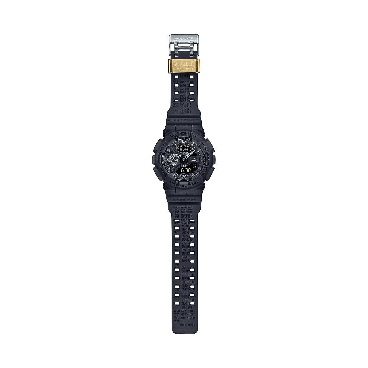 Vier het 40-jarig jubileum dat de mijlpalen van G-SHOCK markeert met een selectie van kenmerkende revivals in solide, beproefd, volledig zwart. Ter ere van de evolutie van het merk herinneren deze speciale ontwerpen de iconische modellen uit het verleden, met hun namen die diep in de band zijn gedrukt voor een ingesneden effect met textuur. Op de DWE-5657, DW-6640 en GA-2140 is een van de knoppen op de zijkant gegraveerd met een ster als knipoog naar het 40-jarig jubileum, net als de GA-114 met een ster op het horlogeglas. De band en de rand van elk model in de serie is gemaakt met harsen van biologische oorsprong. Het logo van het 40-jarig jubileum, ontworpen door Eric Haze, is gegraveerd op de achterkant van de behuizing en verschijnt ook in silhouet als de lichtknop op de DWE-5657 en DW-6640 wordt ingedrukt. Met vier sterren voor 40 jaar gegraveerd op de bandlus en andere speciale details, zijn deze limited edition-uurwerken erfgenamen van de G-SHOCK-geschiedenis.