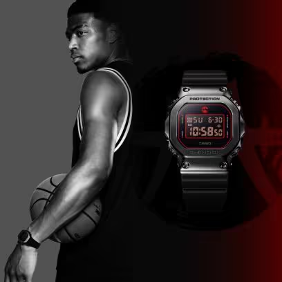 G-SHOCK en Rui Hachimura slaan de handen weer ineen voor zijn vijfde signatuur! Deze intense en robuuste speciale editie is gebaseerd op de GM-5600, met zijn kenmerkende metalen ring. Gefocust en krachtig zwart wordt geaccentueerd met levendig, gepassioneerd rood - G-SHOCK merkkleuren die spreken over Hachimura's kracht en intensiteit terwijl hij naar nieuwe hoogten blijft zweven. Hachimura's kenmerkende ""Black Samurai"" logo siert de bovenkant van de wijzerplaat en de achterkant van de kast. Het logo combineert het kanji-teken 八 (hachi in het Japans, wat ""acht"" betekent) met een afbeelding van een Japans zwaard en vormt zo een ""H""-motief voor ""Hachimura"". Zijn handtekening is ook gegraveerd in de metalen bandlus. Ion-plating op de ring en andere metalen onderdelen voegt een speciale texturale aantrekkingskracht en een verfijnde touch toe. De belangrijkste harscomponenten die zijn toegepast in de kast, de horlogeband en meer zijn gemaakt met hars van biologische oorsprong om de impact op het milieu te verminderen. Dit speciale model wordt geleverd in een indrukwekkend zwart en rood kleurenschema, samen met de originele verpakking.