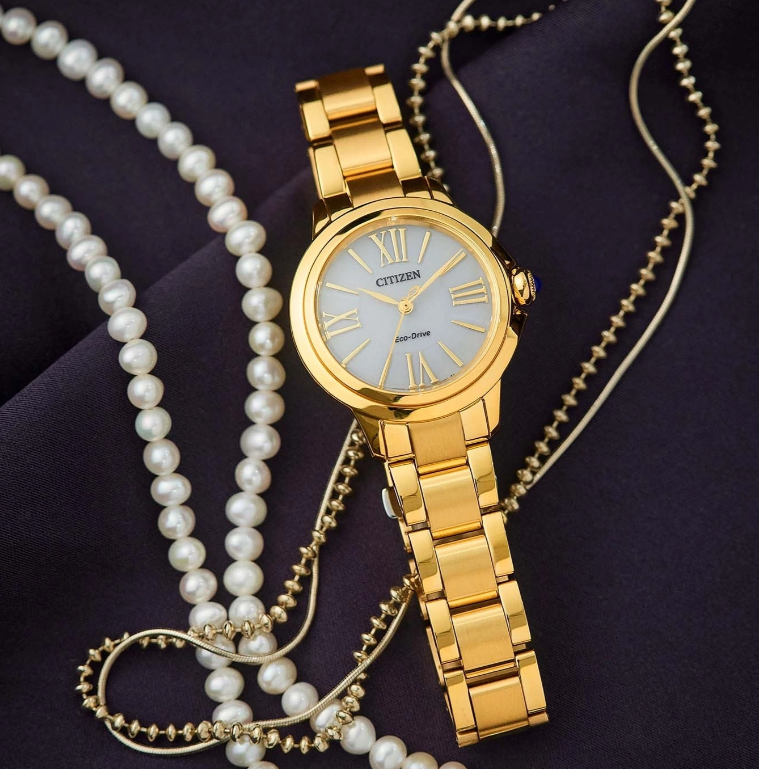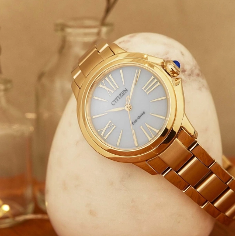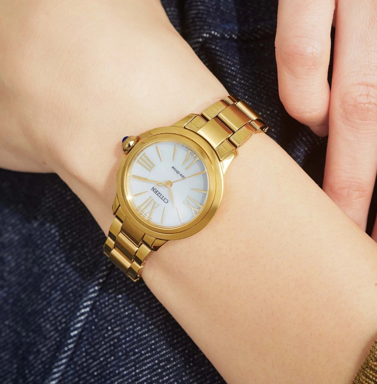 Ontdek het elegante Citizen L horloge voor dames met Eco-Drive technologie. De goudkleurige stalen horlogekast heeft een diameter van 30,25 mm en de witte wijzerplaat met Romeinse en subindexen wordt beschermd door een krasbestendig saffierglas. Het horloge heeft een gangreserve van 180 dagen combineert het betrouwbaarheid met een stijlvol design.