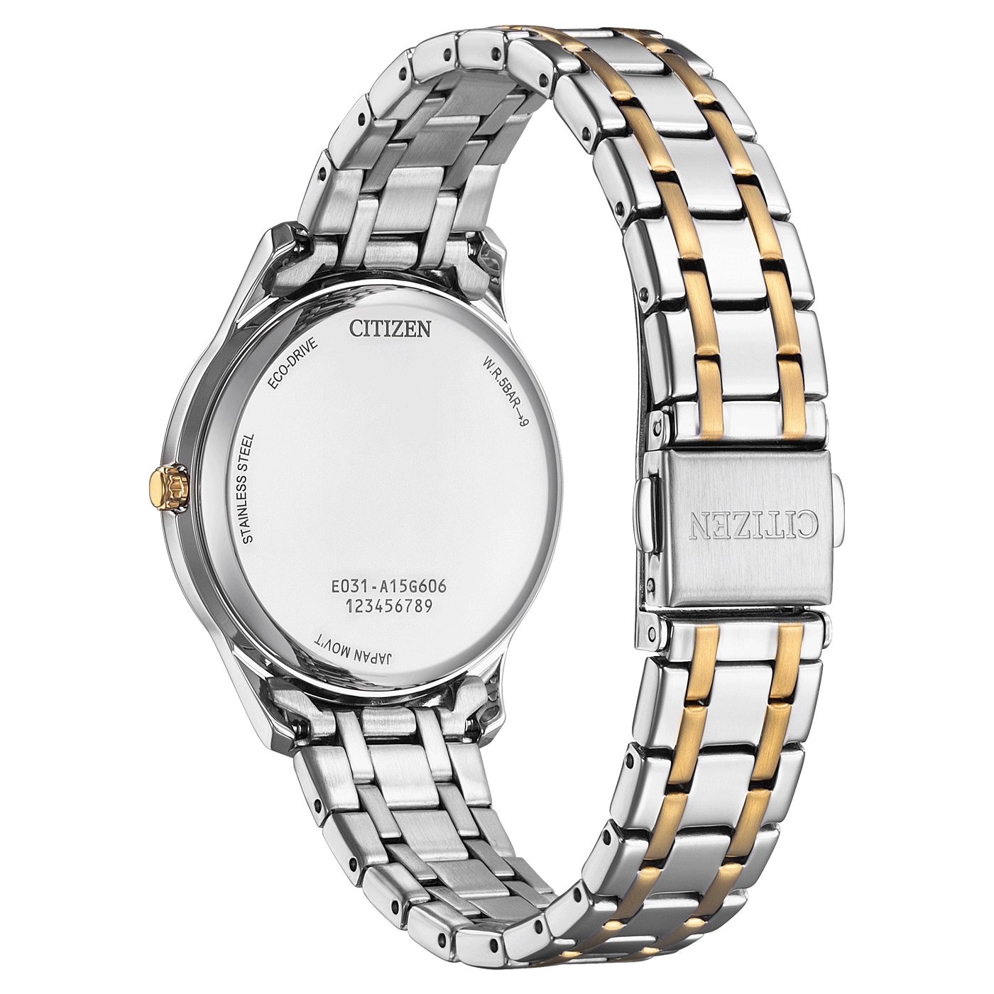 Dit chique Citizen horloge is uitgerust met een Eco-Drive horloge dat u 180 dagen van power voorziet. Het uurwerk is gehuisd in een stalen kast met aansluitend een stalen band. Het horloge is versierd met een roségoud kleurige laag. De parelmoer wijzerplaat wordt beschermd door een kristalglas. Het horloge is waterbestendig tot 5atm / 50 M.