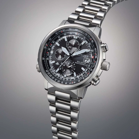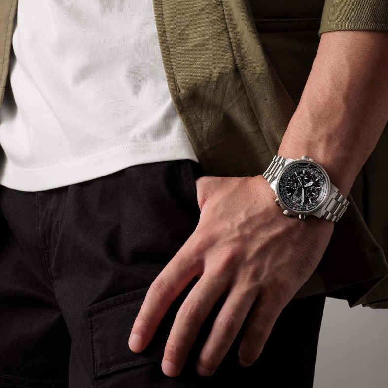 Ontdek de Citizen Promaster Sky met het nauwkeurige Eco-Drive kaliber H800. Deze stalen horlogekast met een diameter van 41 mm herbergt een analoge chronograaf met uitgebreide functies: een 24-uursweergave, anti-magnetisme, indicator van de batterijontlading/het batterijniveau, een eeuwigdurende kalender en stopwatch tot 60 minuten met 1/20 seconde nauwkeurigheid. Het radio controlled horloge synchroniseert wereldwijd (Europa, Japan, USA, China) en biedt tijdzones voor 26 steden en World Time. Het saffierglas beschermt de zwarte wijzerplaat met streepindexen. Met een waterdichtheid van 20 bar en een gangreserve van maximaal 180 dagen is dit horloge een betrouwbare metgezel voor elke dag, en dat zonder een batterij te hoeven vervangen.