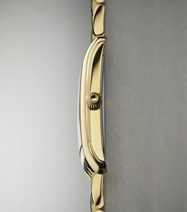 De rechthoekige kast herbergt een zilverkleurige wijzerplaat met minutenwijzer en een kleine onafhankelijke secondewijzer op 6 uur. De uurmarkeringen, geschreven in Romeinse cijfers, lopen parallel aan de minutenwijzer op de wijzerplaat.