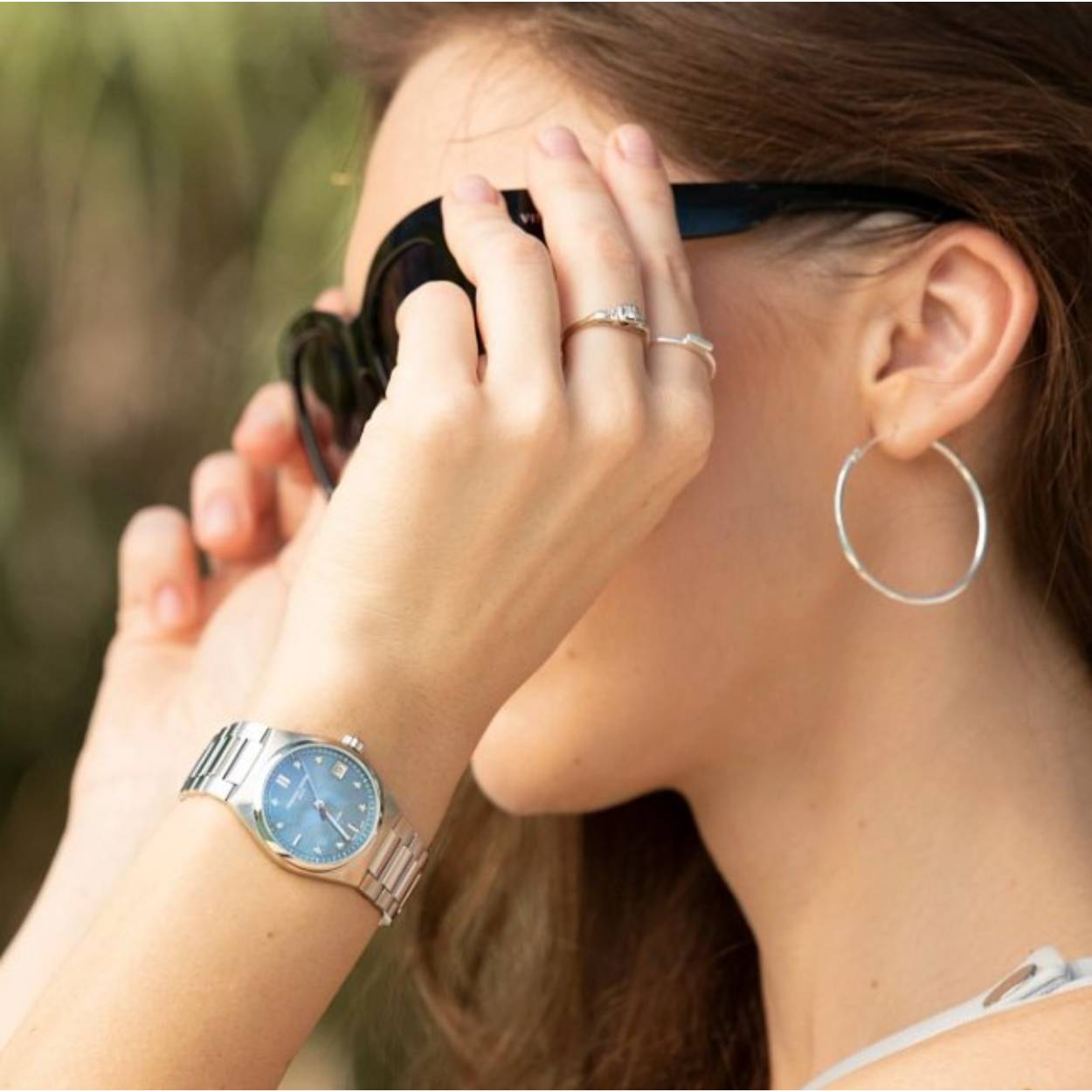 Dit elegante Frederique Constant highlife horloge heeft een stalen kast en band. De ijsblauwe wijzerplaat is versierd met 8 schitterende diamanten met een totaal van 0.04ct, en een datumvenster op 3 uur. Het chique horloge heeft een diameter van 31MM en is getest op een waterdichtheid vn 5 ATM / 50 M. Het horloge heeft een FC-240 Quartz uurwerk. De wijzers en uurmarkeringen zijn afgewerkt met witte superluminova voor een betere leesbaarheid in het donker. Het horloge heeft een krasbestendig saffierglas.