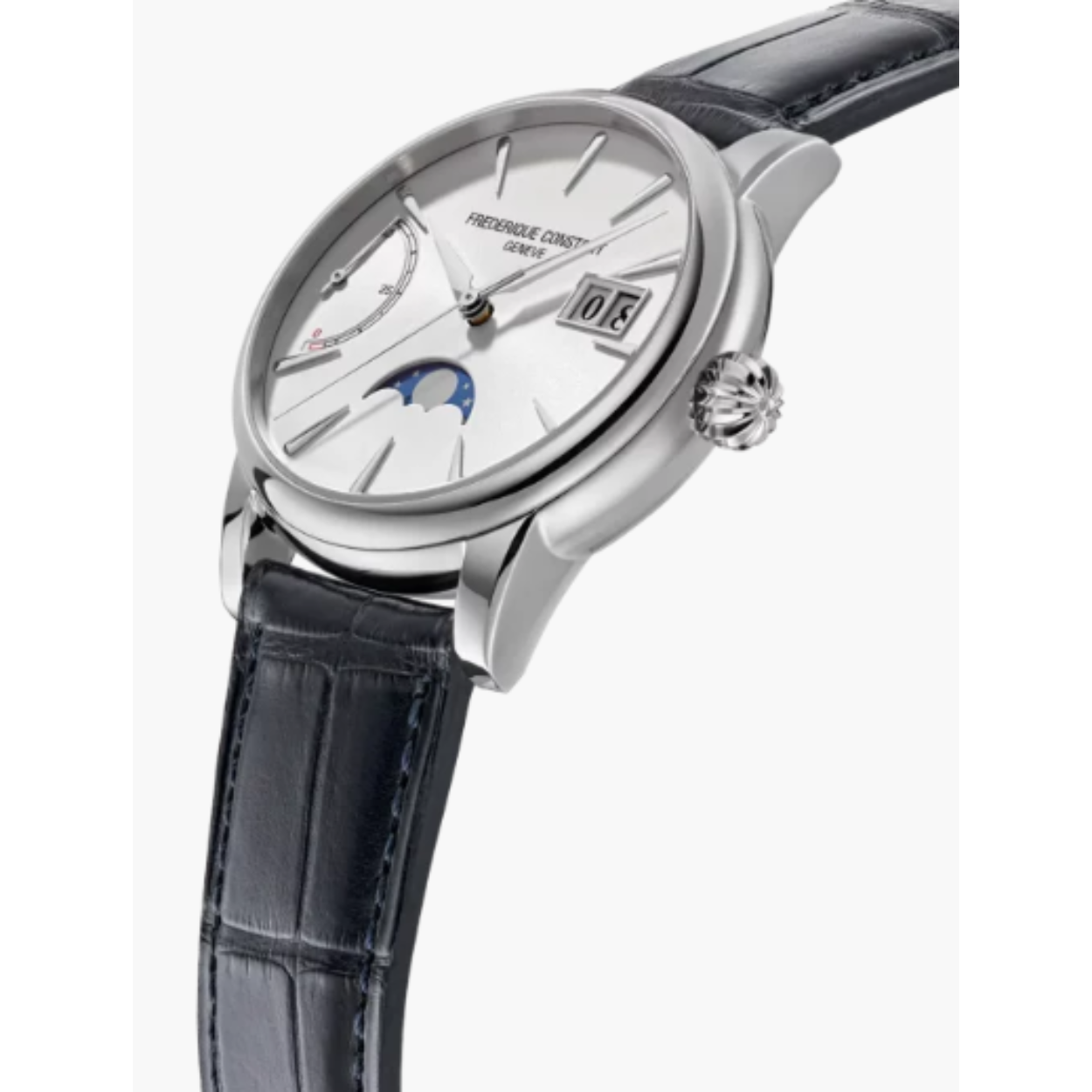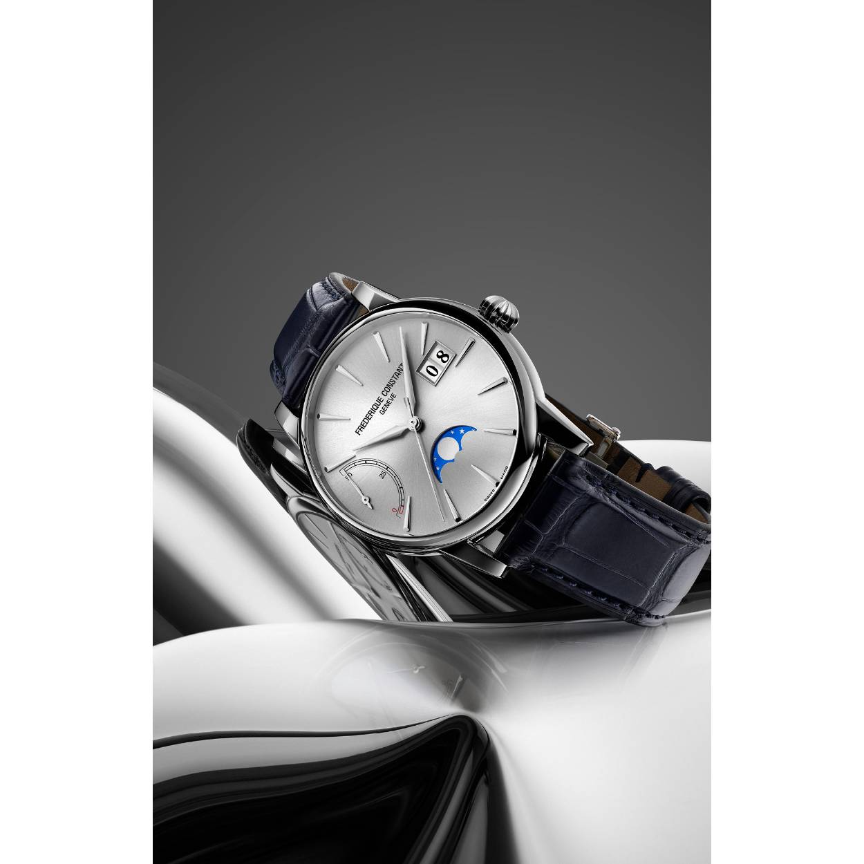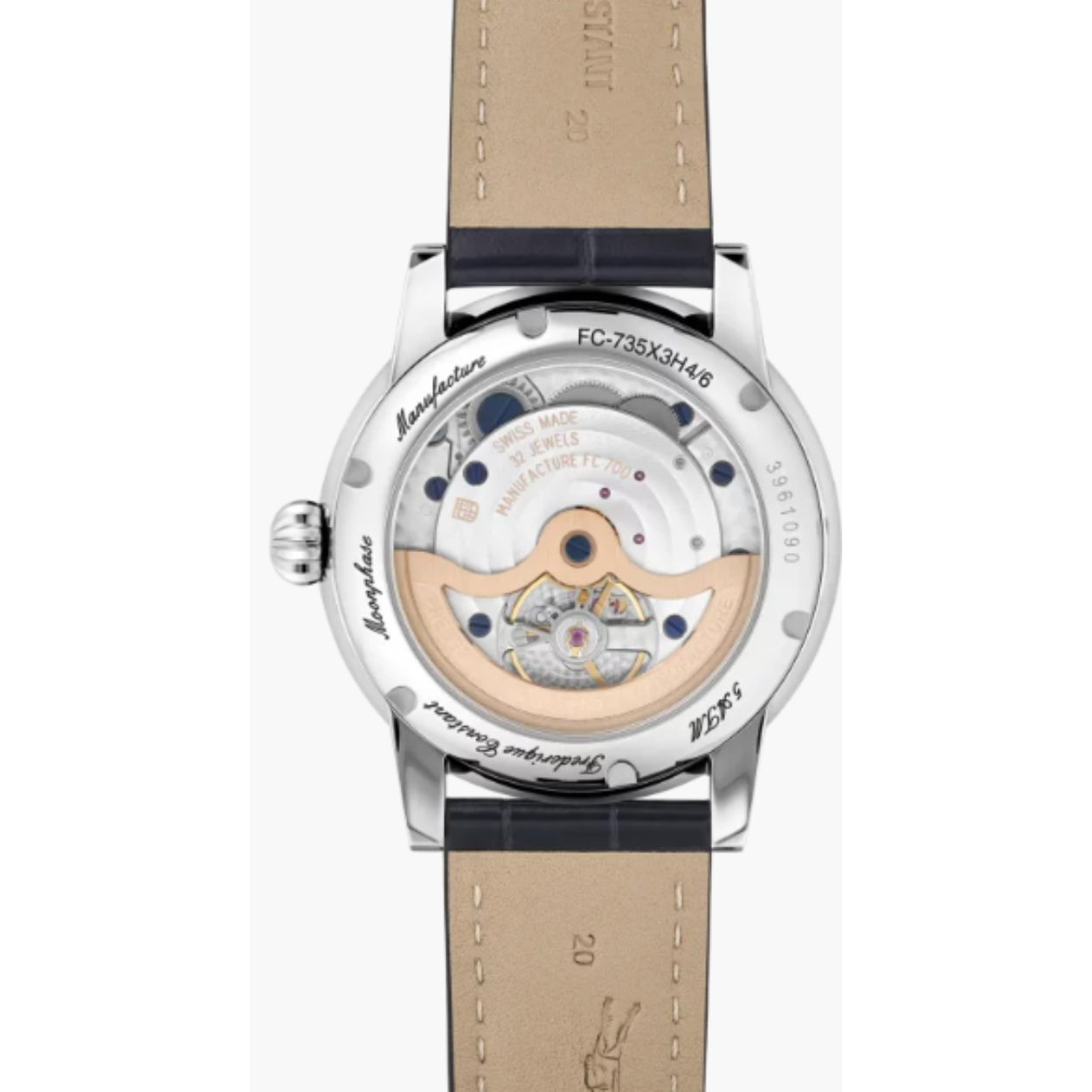 Dit klassieke Frederique Constant horloge heeft een automatisch manufacture FC-735 uurwerk met een gangreserve van 50 uur. Dit in-huis gemaakte uurwerk kent een grote datum, maanfase en gangreserve indicator. Deze 3 zijn te vinden op 3-6- en 9 uur. Het horloge heeft een stalen kast met een blauwe leren band. De 40 MM kast heeft een krasbestendig saffierglas aan beide zijden en is waterbestendig tot 3 ATM / 30 M.