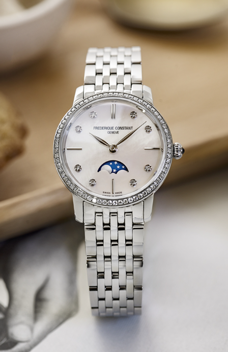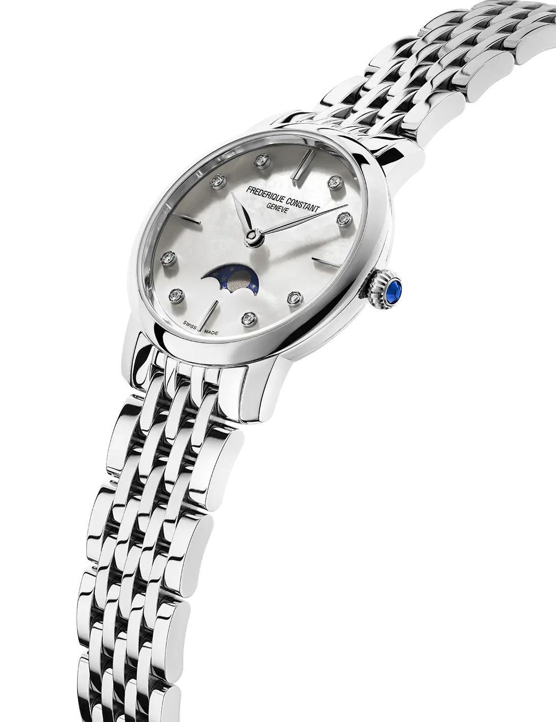 Dit Slimline Moonphase horloge is uitgerust met een Zwitsers quartz uurwerk. Het uurwerk is gehuisd in een 30 MM stalen kast en wordt aangevuld met een stalen schakelband. De witte parelmoer wijzerplaat is versierd met 8 schitterende diamanten met een totaal van 0.04ct. Dit verfijnde model heeft een maanfase op de parelmoer wijzerplaat. Het horloge is voorzien van een krasvrij saffierglas en is getest op een waterdichtheid van 3 ATM / 30 M. Deze kostbare, eigentijdse collectie belichaamt de expertise en het vakmanschap van Frederique Constant, en biedt luxe Zwitserse horloges die betaalbaar zijn en een vleugje hemelse poëzie bieden.