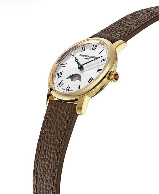 Dit Frederique Constant horloge is uitgerust met een Zwitsers quartz uurwerk. De goudkleurige kast is gemaakt van edelstaal. De bruine lederen band is voorzien van een goudkleurige gesp. De witte wijzerplaat is voorzien van romeinse cijfers als uuraanduidingen en is versierd met een chique moonphase op 6-uur. Het horloge is voorzien van saffierglas en is getest op een waterdichtheid van 3 ATM / 30 M.