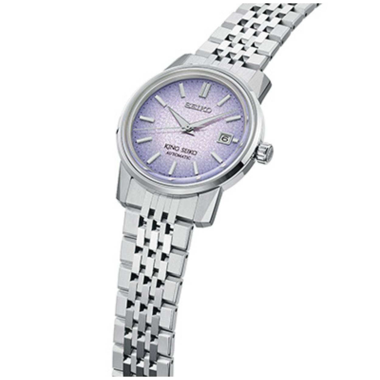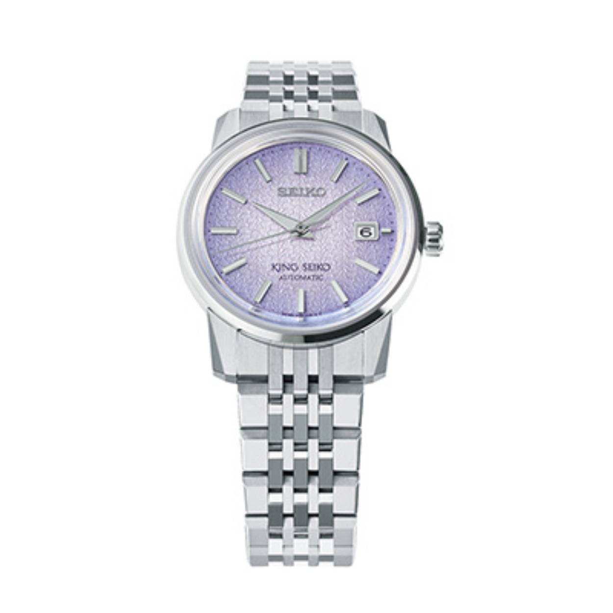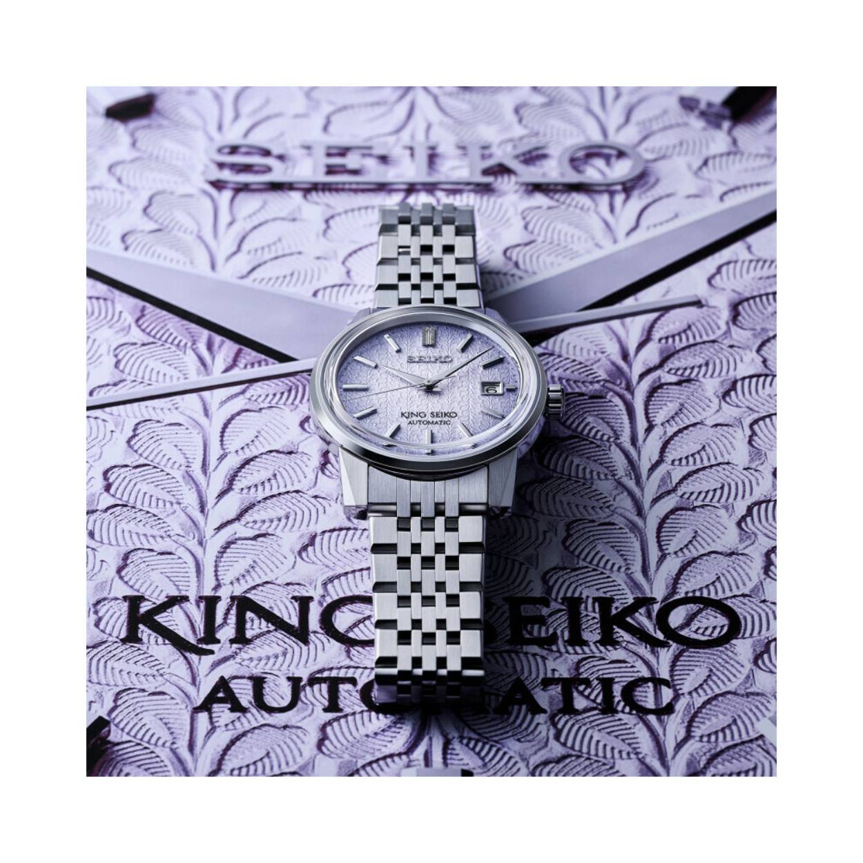 Het Japanse concept van 'Ukiyo-e' is een vorm van Japanse kunst die begon in de 17e eeuw. De afbeeldingen worden uitgedrukt in de vorm van houtsnedes of schilderijen van traditionele culturele Japanse scènes - meestal met Kabuki-artiesten, Sumo-worstelaars, historische scènes, volksverhalen, landschappen of de natuur. De wijzerplaat van dit King Seiko-horloge is geïnspireerd op de natuur in Kameido, waar het merk King Seiko begon, ontworpen in de vorm van kiyo-e.