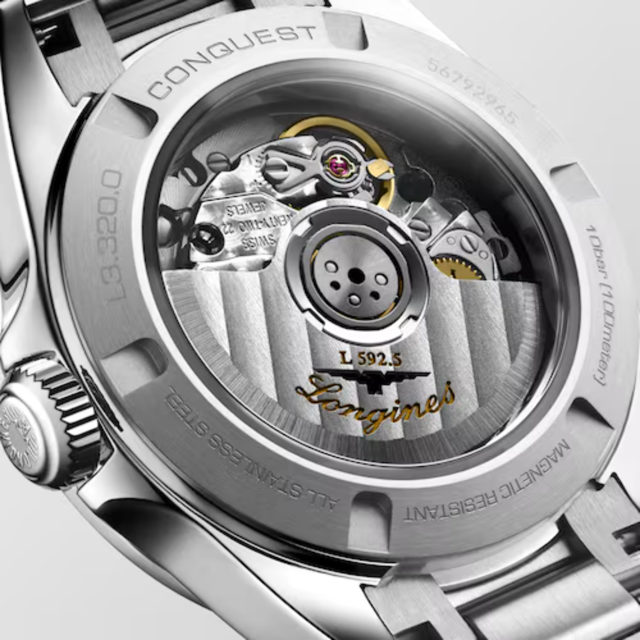 Dit Longines Conquest horloge is uitgerust met een automatisch kaliber L592 met een powerreserve van 45 uur. De kast en band zijn gemaakt van staal. Het horloge heeft een diameter van 30 MM en is getest op een waterdichtheid van 10 ATM / 100 M. De witte parelmoer wijzerplaat is versierd met 15 Top Wesselton VS-SI diamanten met een totaal van 0.037ct. Op de lunette schitteren nog eens 48 Top Wesselton IF-VVS diamanten met een totaal van 0.326ct. Het horloge heeft een krasvrij saffierglas met een anti-reflectieve coating.