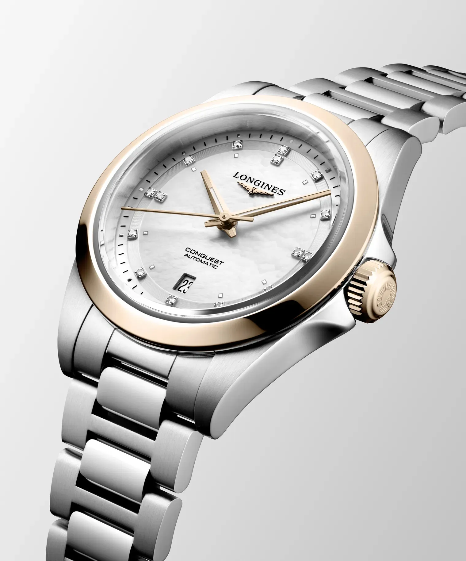 Dit Longines Conquest horloge is uitgerust met een automatisch uurwerk, met een monokristallijne silicium balansveer gangreserve tot 45 uur. De kast is gemaakt van edelstaal en 18-karaats roségouden cap 200, de band is ook gemaakt van edelstaal. Het horloge heeft een diameter van 30mm en is getest op een waterdichtheid van 10 ATM / 100 M. De witte parelmoer wijzerplaat is voorzien van een datumvenster op 6 uur en rosegoudkleurige wijzers en diamanten indexen. Het horloge heeft een krasvrij saffierglas met een anti-reflectieve coating aan beide zijden.