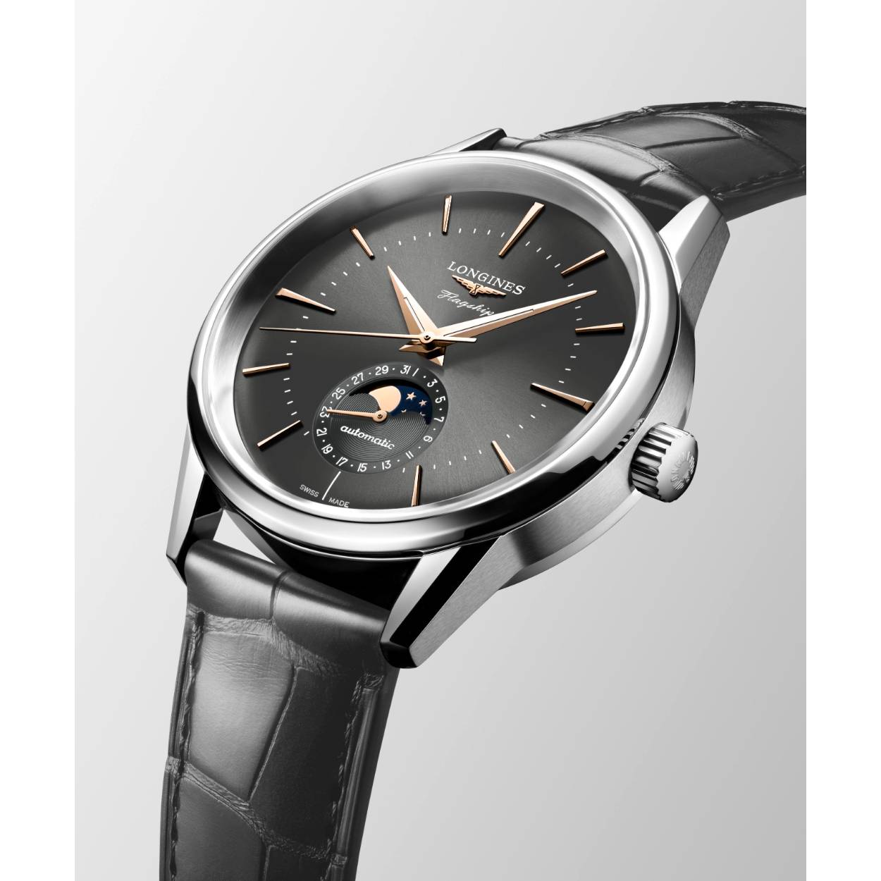 Dit Longines horloge is uitgerust met een automatisch L899 uurwerk met een gangreserve van 72 uur. Het horloge heeft een stalen kast met een diameter van 38,5MM en heeft een grijze alligator leren band. De grijze wijzerplaat is versierd met roségoudkleurige wijzers en indexen die zorgen voor een chique look, afgemaakt door de maanfase op 6 - uur. De wijzers en indexen zijn subtiel voorzien van Zwitsers Super-LumiNova® voor een betere leesbaarheid in het donker. Het horloge is getest op een waterdichtheid van 3 ATM / 30 M en is voorzien van een krasvrij saffierglas met een anti-reflectieve coating aan beide zijden.