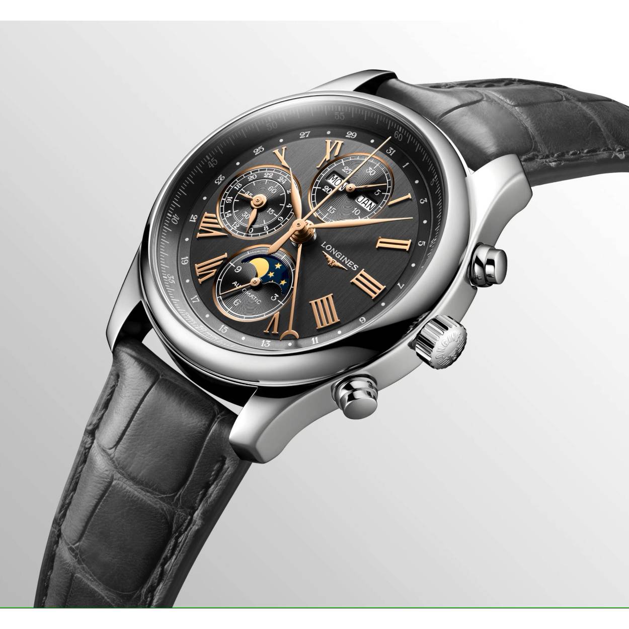 De Longines is voorzien van een automatisch kaliber L687 uurwerk met een gangreserve van 66 uur. De kast is gemaakt van roestvrij staal en de antraciete band van leer. Het horloge heeft een diameter van 42 mm en is getest op een waterdichtheid van 3 ATM / 30 meter. Met een wijzer met halve maan wordt in de wijzerplaat de datum aangeduid. Het horloge heeft een kleine seconde wijzer op 9 uur en een maanfase op 6 uur. Het horloge heeft een krasbestendig saffierglas met meerdere lagen anti-reflecterende coating aan beide zijden