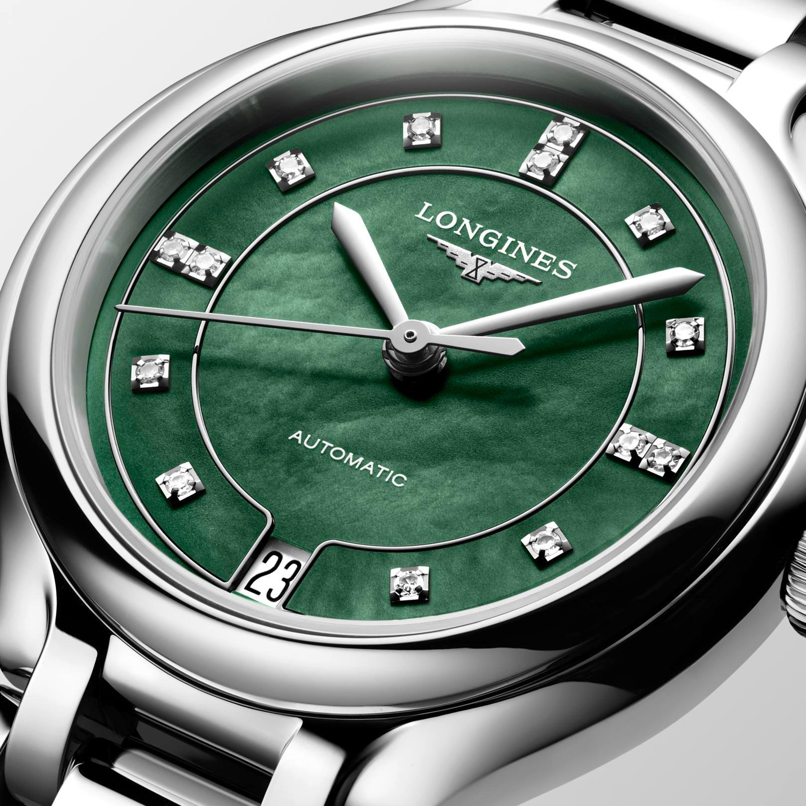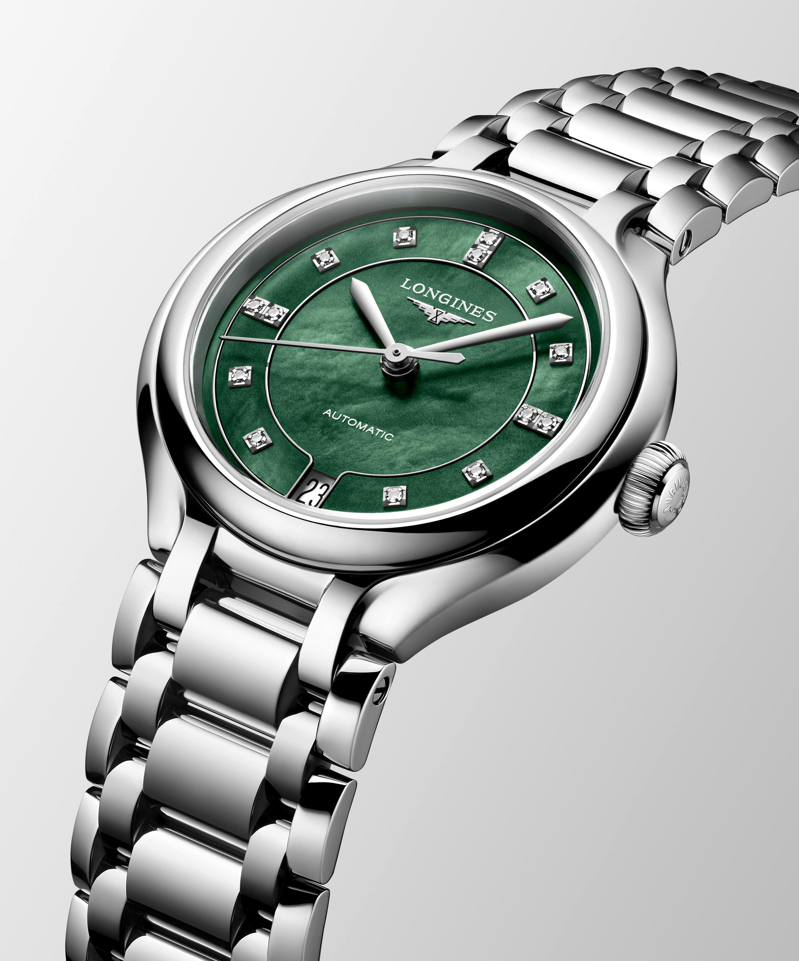 De Longines is voorzien van een automatisch uurwerk. De kast en band zijn gemaakt van roestvrij staal. Het horloge heeft een diameter van 34 mm en is getest op een waterdichtheid van 3 ATM / 30 meter. De groene wijzerplaat heeft diamanten indexen met een totaalgewicht van 0,060ct en onderin de datumfunctie. Het horloge heeft een krasbestendig saffierglas met meerdere lagen anti-reflecterende coating aan beide zijden.