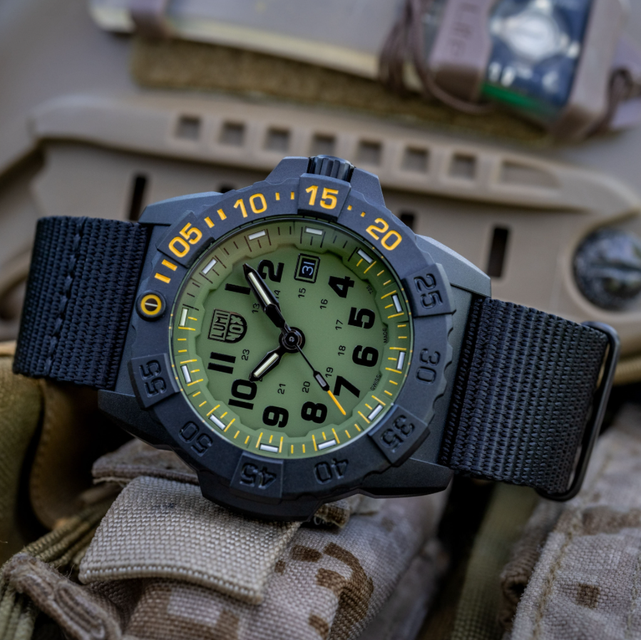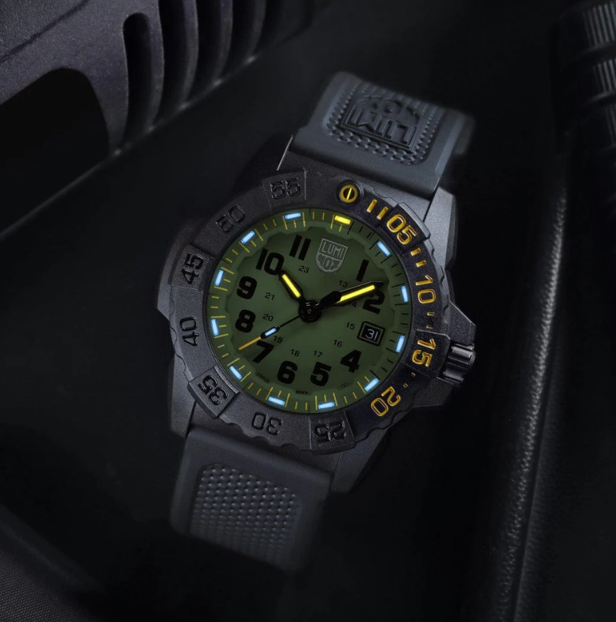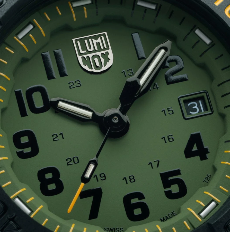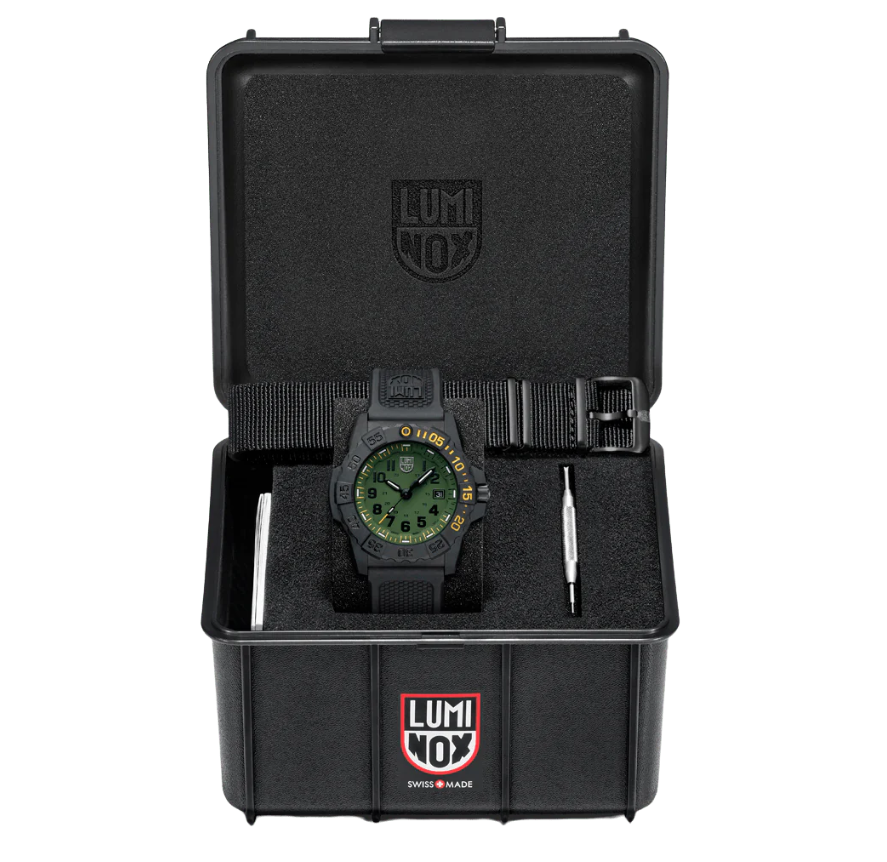 De Navy SEAL Foundation XS.3517.NSF.SET weerspiegelt Luminox' nauwe band met elite militaire eenheden met een opvallende militair groene en gele kleurencombinatie. Gebouwd met een robuuste 45 mm CARBONOX™ kast en bezel, is het horloge ontworpen om extreme omstandigheden te weerstaan ​​en is het waterbestendig tot 200 meter. De wijzerplaat is beschermd door krasbestendig gehard mineraalglas en versterkt door Luminox' kenmerkende Light Technology, die zorgt voor constante zichtbaarheid in alle lichtomstandigheden tot wel 25 jaar. De ijsblauwe en gele LLT-buizen zorgen ervoor dat de gloed van de wijzerplaat overeenkomt met de kleuren van het logo van de Navy SEAL Foundation dat in de achterkant van de kast is gegraveerd. Het opvallende horloge wordt geleverd met een duurzame zwarte rubberen band en een extra zwarte NATO-band voor veelzijdigheid. Zoals alle Navy SEAL Foundation-modellen is dit horloge meer dan alleen een horloge - het is een eerbetoon aan de veerkracht en moed van
